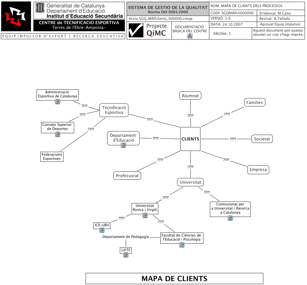 This Concept Map has information related to: SGQ_MAPclients_000000, Tecnificació Esportiva ???? Consejo Superior de Deportes, Facultat de Ciències de l'Educació i Psicologia Departament de Pedagogia L@TE, Universitat ???? Universitat Rovira i Virgili, Alumnat ???? CLIENTS, Tecnificació Esportiva ???? CLIENTS, Professorat ???? CLIENTS, Societat ???? CLIENTS, Empresa ???? CLIENTS, Departament d'Educació ???? CLIENTS, Families ???? CLIENTS