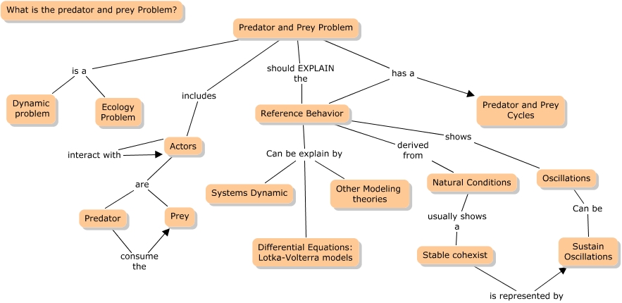 What is the predator and prey Problem, Oscillations Can be Sustain Oscillations, Reference Behavior shows Oscillations, Predator and Prey Problem has a Reference Behavior, Reference Behavior derived from Natural Conditions, Predator and Prey Problem is a Dynamic problem, Predator consume the Prey, Predator and Prey Problem includes Actors, Reference Behavior Can be explain by Differential Equations: Lotka-Volterra models, Reference Behavior Can be explain by Systems Dynamic, Natural Conditions usually shows a Stable cohexist