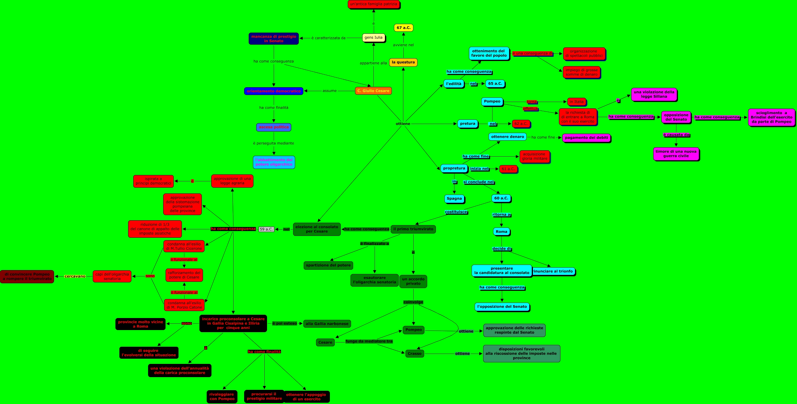 Questa Mappa Concettuale ha informazioni correlate a: ascesa di cesare daniele, Pompeo torna in Italia, un accordo privato coinvolge Pompeo, incarico proconsolare a Cesare in Gallia Cisalpina e Illiria per cinque anni ha come finalità procurarsi il prestigio militare, il primo triumvirato ha come conseguenza elezione al consolato per Cesare, 59 a.C. ha come conseguenza incarico proconsolare a Cesare in Gallia Cisalpina e Illiria per cinque anni, ascesa politica è perseguita mediante l'abbattimento del potere oligarchico, C. Giulio Cesare ottiene la questura, incarico proconsolare a Cesare in Gallia Cisalpina e Illiria per cinque anni ha come finalità rivaleggiare con Pompeo, la questura avviene nel 67 a.C., C. Giulio Cesare appartiene alla gens Iulia, incarico proconsolare a Cesare in Gallia Cisalpina e Illiria per cinque anni sono provincie molto vicine a Roma, incarico proconsolare a Cesare in Gallia Cisalpina e Illiria per cinque anni sono di seguire l'evolversi della situazione, condanna all'esilio di M. Porzio Catone è funzionale al rafforzamento del potere di Cesare, propretura ha come fine acquisizione gloria militare, condanna all'esilio di M.Tullio Cicerone è funzionale al rafforzamento del potere di Cesare, 59 a.C. ha come conseguenza condanna all'esilio di M. Porzio Catone, l'edilità ha come conseguenza ottenimento del favore del popolo, gens Iulia è caratterizzata da mancanza di prestigio in Senato, C. Giulio Cesare assume orientamento democratico, Pompeo nel 62 a.C.