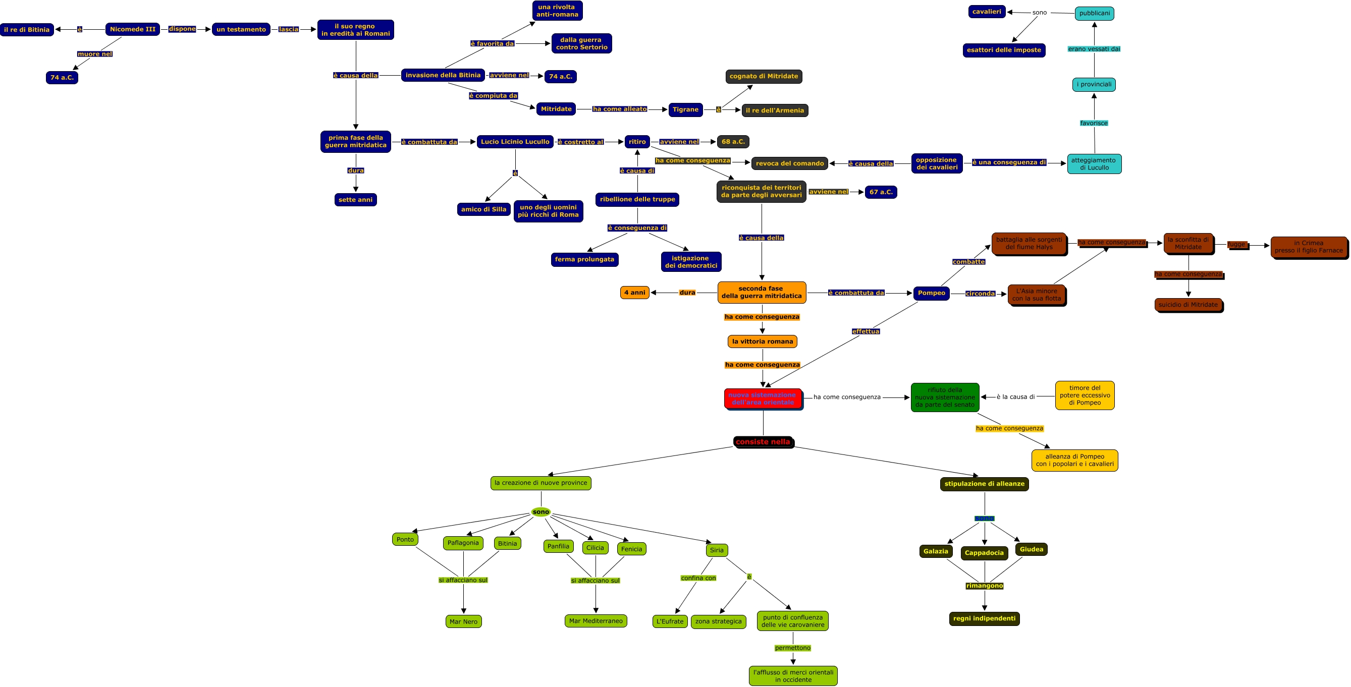 Questa Mappa Concettuale ha informazioni correlate a: Guerra mitridatica daniele, Siria è punto di confluenza delle vie carovaniere, invasione della Bitinia è favorita da una rivolta anti-romana, seconda fase della guerra mitridatica dura 4 anni, Pompeo circonda L'Asia minore con la sua flotta, la creazione di nuove province sono Bitinia, Paflagonia si affacciano sul Mar Nero, la sconfitta di Mitridate ha come conseguenza suicidio di Mitridate, pubblicani sono cavalieri, stipulazione di alleanze sono Galazia, battaglia alle sorgenti del fiume Halys ha come conseguenza la sconfitta di Mitridate, prima fase della guerra mitridatica dura sette anni, Fenicia si affacciano sul Mar Mediterraneo, ritiro ha come conseguenza riconquista dei territori da parte degli avversari, nuova sistemazione dell'area orientale consiste nella stipulazione di alleanze, atteggiamento di Lucullo favorisce i provinciali, Tigrane è cognato di Mitridate, opposizione dei cavalieri è causa della revoca del comando, prima fase della guerra mitridatica è combattuta da Lucio Licinio Lucullo, punto di confluenza delle vie carovaniere permettono l'afflusso di merci orientali in occidente, Lucio Licinio Lucullo è uno degli uomini più ricchi di Roma