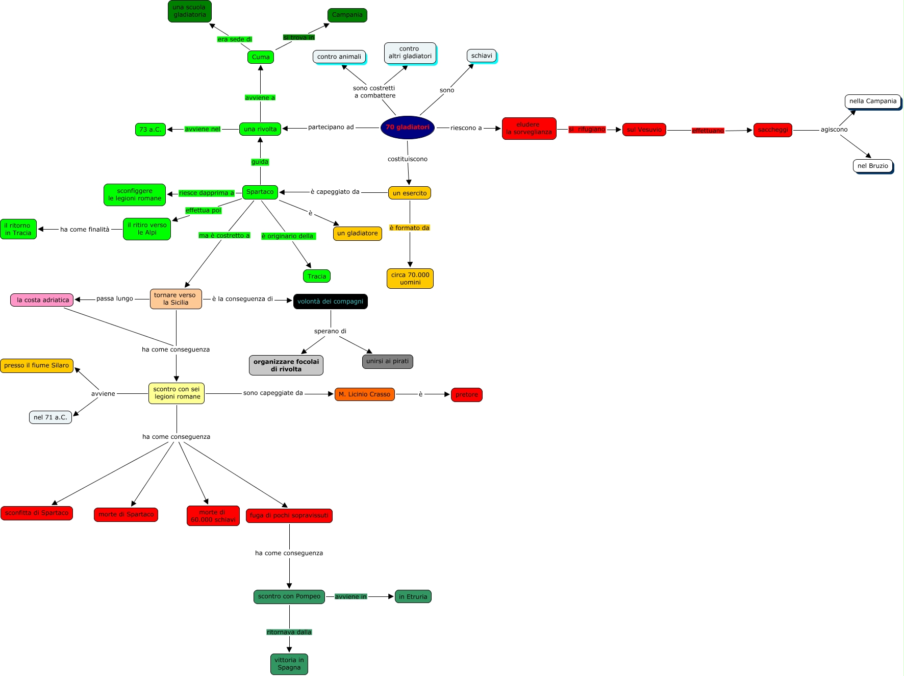 Questa Mappa Concettuale ha informazioni correlate a: Spartaco daniele, volontà dei compagni sperano di unirsi ai pirati, Spartaco è originario della Tracia, Spartaco è un gladiatore, scontro con sei legioni romane ha come conseguenza morte di Spartaco, un esercito è formato da circa 70.000 uomini, eludere la sorveglianza si rifugiano sul Vesuvio, tornare verso la Sicilia ha come conseguenza scontro con sei legioni romane, scontro con Pompeo ritornava dalla vittoria in Spagna, 70 gladiatori riescono a eludere la sorveglianza, Spartaco riesce dapprima a sconfiggere le legioni romane, un esercito è capeggiato da Spartaco, volontà dei compagni sperano di organizzare focolai di rivolta, scontro con sei legioni romane avviene nel 71 a.C., scontro con sei legioni romane avviene presso il fiume Silaro, tornare verso la Sicilia è la conseguenza di volontà dei compagni, Spartaco guida una rivolta, Spartaco effettua poi il ritiro verso le Alpi, saccheggi agiscono nel Bruzio, fuga di pochi sopravissuti ha come conseguenza scontro con Pompeo, saccheggi agiscono nella Campania