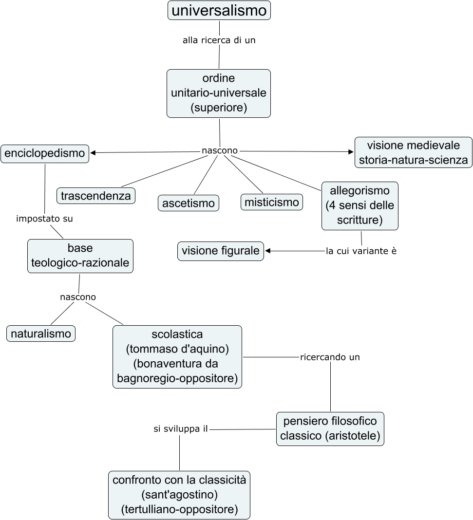 Questa Mappa Concettuale ha informazioni correlate a: rocco massi e valente, universalismo alla ricerca di un ordine unitario-universale (superiore), ordine unitario-universale (superiore) nascono enciclopedismo, base teologico-razionale nascono naturalismo, base teologico-razionale nascono scolastica (tommaso d'aquino) (bonaventura da bagnoregio-oppositore), pensiero filosofico classico (aristotele) si sviluppa il confronto con la classicità (sant'agostino) (tertulliano-oppositore), ordine unitario-universale (superiore) nascono ascetismo, allegorismo (4 sensi delle scritture) la cui variante è visione figurale, scolastica (tommaso d'aquino) (bonaventura da bagnoregio-oppositore) ricercando un pensiero filosofico classico (aristotele), enciclopedismo impostato su base teologico-razionale, ordine unitario-universale (superiore) nascono trascendenza