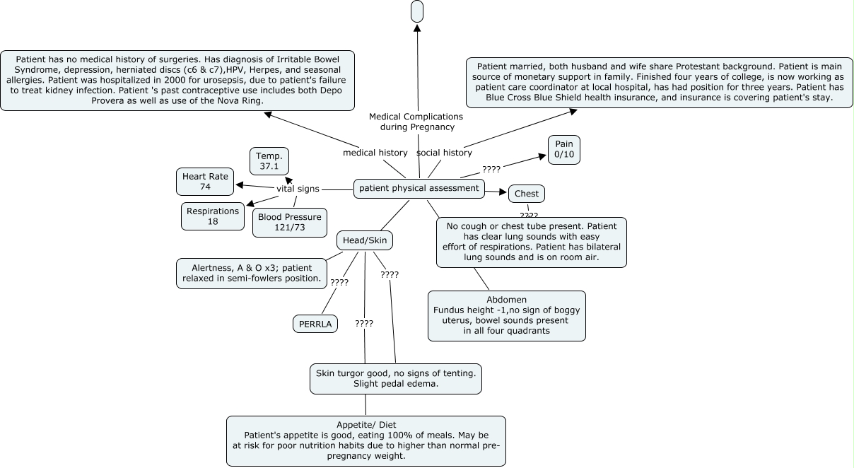 This Concept Map has information related to: rogatto, Head/Skin ???? Skin turgor good, no signs of tenting. Slight pedal edema., patient physical assessment Medical Complications during Pregnancy , patient physical assessment vital signs Temp. 37.1, patient physical assessment ???? Chest, patient physical assessment vital signs Blood Pressure 121/73, patient physical assessment vital signs Respirations 18, Head/Skin ???? PERRLA, Chest ???? No cough or chest tube present. Patient has clear lung sounds with easy effort of respirations. Patient has bilateral lung sounds and is on room air., Head/Skin ???? Alertness, A & O x3; patient relaxed in semi-fowlers position., patient physical assessment social history Patient married, both husband and wife share Protestant background. Patient is main source of monetary support in family. Finished four years of college, is now working as patient care coordinator at local hospital, has had position for three years. Patient has Blue Cross Blue Shield health insurance, and insurance is covering patient's stay.