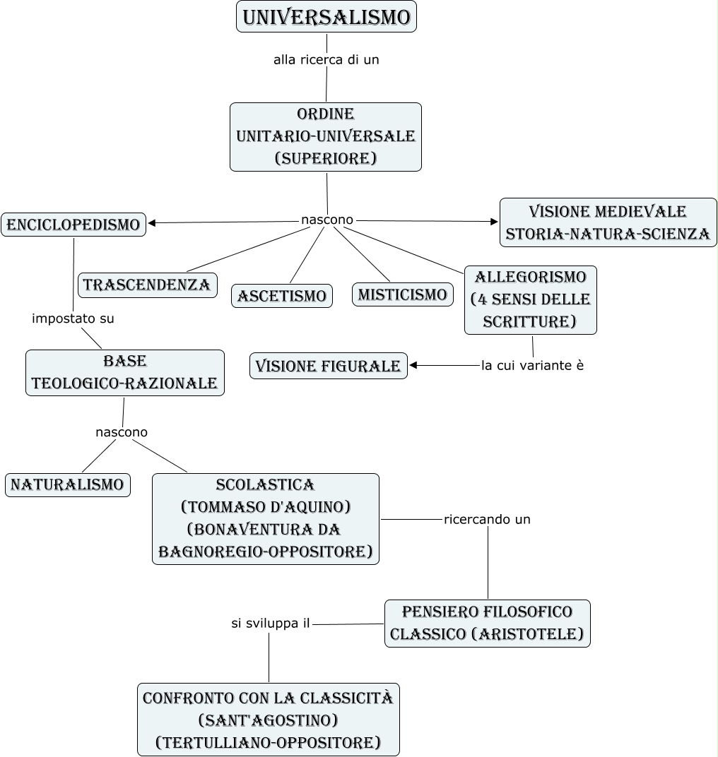 Questa Mappa Concettuale ha informazioni correlate a: rocco massimino valente 1, universalismo alla ricerca di un ordine unitario-universale (superiore), ordine unitario-universale (superiore) nascono enciclopedismo, base teologico-razionale nascono naturalismo, base teologico-razionale nascono scolastica (tommaso d'aquino) (bonaventura da bagnoregio-oppositore), pensiero filosofico classico (aristotele) si sviluppa il confronto con la classicità (sant'agostino) (tertulliano-oppositore), ordine unitario-universale (superiore) nascono ascetismo, allegorismo (4 sensi delle scritture) la cui variante è visione figurale, scolastica (tommaso d'aquino) (bonaventura da bagnoregio-oppositore) ricercando un pensiero filosofico classico (aristotele), enciclopedismo impostato su base teologico-razionale, ordine unitario-universale (superiore) nascono trascendenza