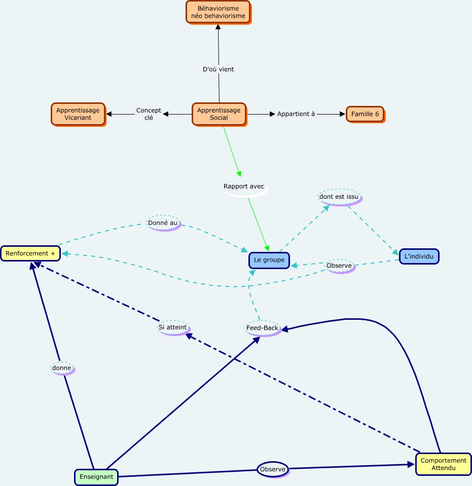 This Concept Map, created with IHMC CmapTools, has information related to: Famille 6 LU, Renforcement + Donné au Le groupe, Enseignant donne Renforcement +, Comportement Attendu Feed-Back Le groupe, Apprentissage Social D'où vient Béhaviorisme néo behaviorisme, L'individu Observe Renforcement +, Comportement Attendu Si atteint Renforcement +, L'individu Observe Le groupe, Apprentissage Social Concept clé Apprentissage Vicariant, Apprentissage Social Rapport avec Le groupe, Enseignant Observe Comportement Attendu, Apprentissage Social Appartient à Famille 6, Le groupe dont est issu L'individu, Enseignant Feed-Back Le groupe