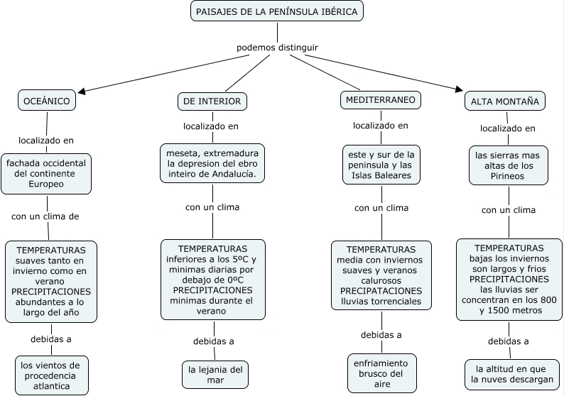 Este mapa conceptual tiene información relacionada a: chantal flores izquierdo Un.2, este y sur de la peninsula y las Islas Baleares con un clima TEMPERATURAS media con inviernos suaves y veranos calurosos PRECIPATACIONES lluvias torrenciales, PAISAJES DE LA PENÍNSULA IBÉRICA podemos distinguir ALTA MONTAÑA, ALTA MONTAÑA localizado en las sierras mas altas de los Pirineos, meseta, extremadura la depresion del ebro inteiro de Andalucía. con un clima TEMPERATURAS inferiores a los 5ºC y minimas diarias por debajo de 0ºC PRECIPITACIONES minimas durante el verano, OCEÁNICO localizado en fachada occidental del continente Europeo, MEDITERRANEO localizado en este y sur de la peninsula y las Islas Baleares, PAISAJES DE LA PENÍNSULA IBÉRICA podemos distinguir DE INTERIOR, TEMPERATURAS inferiores a los 5ºC y minimas diarias por debajo de 0ºC PRECIPITACIONES minimas durante el verano debidas a la lejania del mar, fachada occidental del continente Europeo con un clima de TEMPERATURAS suaves tanto en invierno como en verano PRECIPITACIONES abundantes a lo largo del año, PAISAJES DE LA PENÍNSULA IBÉRICA podemos distinguir OCEÁNICO