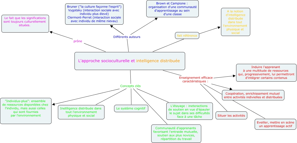 This Concept Map, created with IHMC CmapTools, has information related to: Famille 2 approche socioculturelle et intelligence distribuée, L'approche socioculturelle et intelligence distribuée Enseignement efficace caractéristiques : Coopération, enrichissement mutuel entre activités indivielles et distribuées, L'approche socioculturelle et intelligence distribuée Différents auteurs Brown et Campione : organisation d'une communauté d'apprentissage au sein d'une classe, L'approche socioculturelle et intelligence distribuée Concepts clés Le système cognitif, L'approche socioculturelle et intelligence distribuée Enseignement efficace caractéristiques : Situer les activités, L'approche socioculturelle et intelligence distribuée Concepts clés L'étayage : ineteractions de soutien en vue d'épauler le sujet dans ses difficultés face à une tâche, L'approche socioculturelle et intelligence distribuée Concepts clés Communauté d'apprenants favorisant l'entraide mutuelle, soutien aux plus novices, répartition du travail, L'approche socioculturelle et intelligence distribuée ???? A la notion d'intelligence distribuée dans tout l'environnement physique et social, L'approche socioculturelle et intelligence distribuée Concepts clés Inetlligence distribuée dans tout l'environnement physique et social, L'approche socioculturelle et intelligence distribuée Différents auteurs Bruner ("la culture façonne l'esprit") Vygotsky (interaction sociale avec individu plus élevé) Clermont-Perret (interaction sociale avec individu de même nievau), L'approche socioculturelle et intelligence distribuée prône Le fait que les significations sont toujours culturellement situées., L'approche socioculturelle et intelligence distribuée Différents auteurs Bruner ("la culture façonne l'esprit") Vygotsky (interaction sociale avec individu plus élevé) Clermont-Perret (interaction sociale avec individu de même nievau), L'approche socioculturelle et intelligence distribuée Enseignement efficace caractéristiques : Induire l'apprenant à une multitude de ressources qui, progressivement, lui permettront d'intégrer certains contenus, L'approche socioculturelle et intelligence distribuée Concepts clés "Individus-plus": ensemble de ressources disponibles chez l'individu, mais aussi celles qui sont fournies par l'environnement, L'approche socioculturelle et intelligence distribuée Enseignement efficace caractéristiques : Eveiller, mettre en scène un apprentissage actif