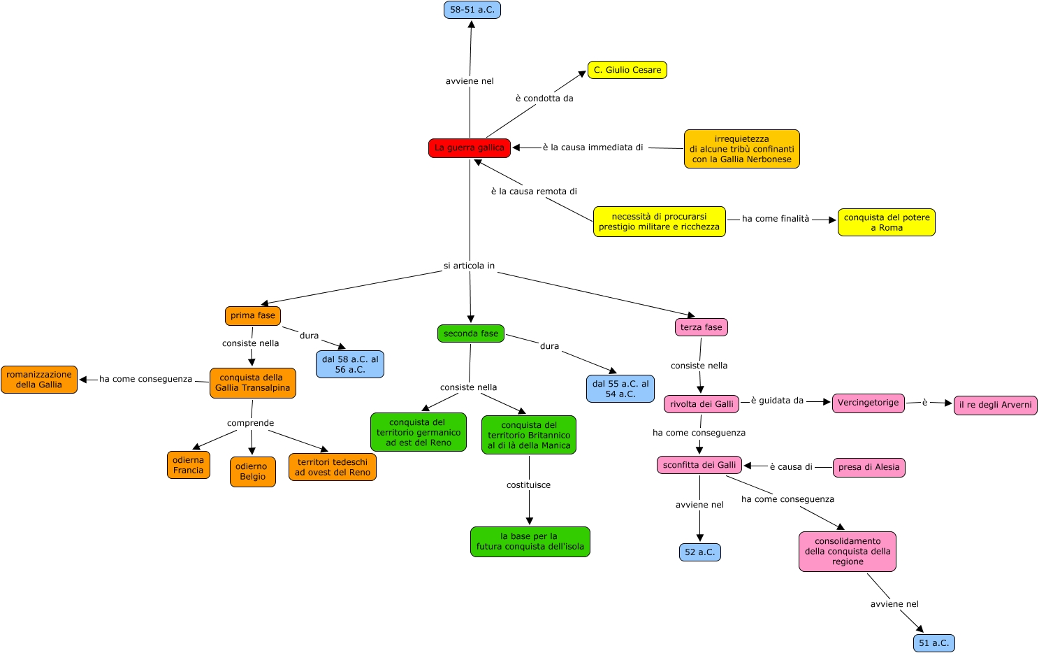 Questa Mappa Concettuale ha informazioni correlate a: La guerra gallica marchetti asquini, La guerra gallica si articola in prima fase, seconda fase dura dal 55 a.C. al 54 a.C., La guerra gallica si articola in terza fase, Vercingetorige è il re degli Arverni, prima fase consiste nella conquista della Gallia Transalpina, necessità di procurarsi prestigio militare e ricchezza è la causa remota di La guerra gallica, prima fase dura dal 58 a.C. al 56 a.C., presa di Alesia è causa di sconfitta dei Galli, necessità di procurarsi prestigio militare e ricchezza ha come finalità conquista del potere a Roma, conquista della Gallia Transalpina comprende odierno Belgio, consolidamento della conquista della regione avviene nel 51 a.C., La guerra gallica è condotta da C. Giulio Cesare, seconda fase consiste nella conquista del territorio germanico ad est del Reno, irrequietezza di alcune tribù confinanti con la Gallia Nerbonese è la causa immediata di La guerra gallica, conquista della Gallia Transalpina comprende territori tedeschi ad ovest del Reno, conquista della Gallia Transalpina ha come conseguenza romanizzazione della Gallia, La guerra gallica avviene nel 58-51 a.C., sconfitta dei Galli ha come conseguenza consolidamento della conquista della regione, rivolta dei Galli è guidata da Vercingetorige, conquista del territorio Britannico al di là della Manica costituisce la base per la futura conquista dell'isola