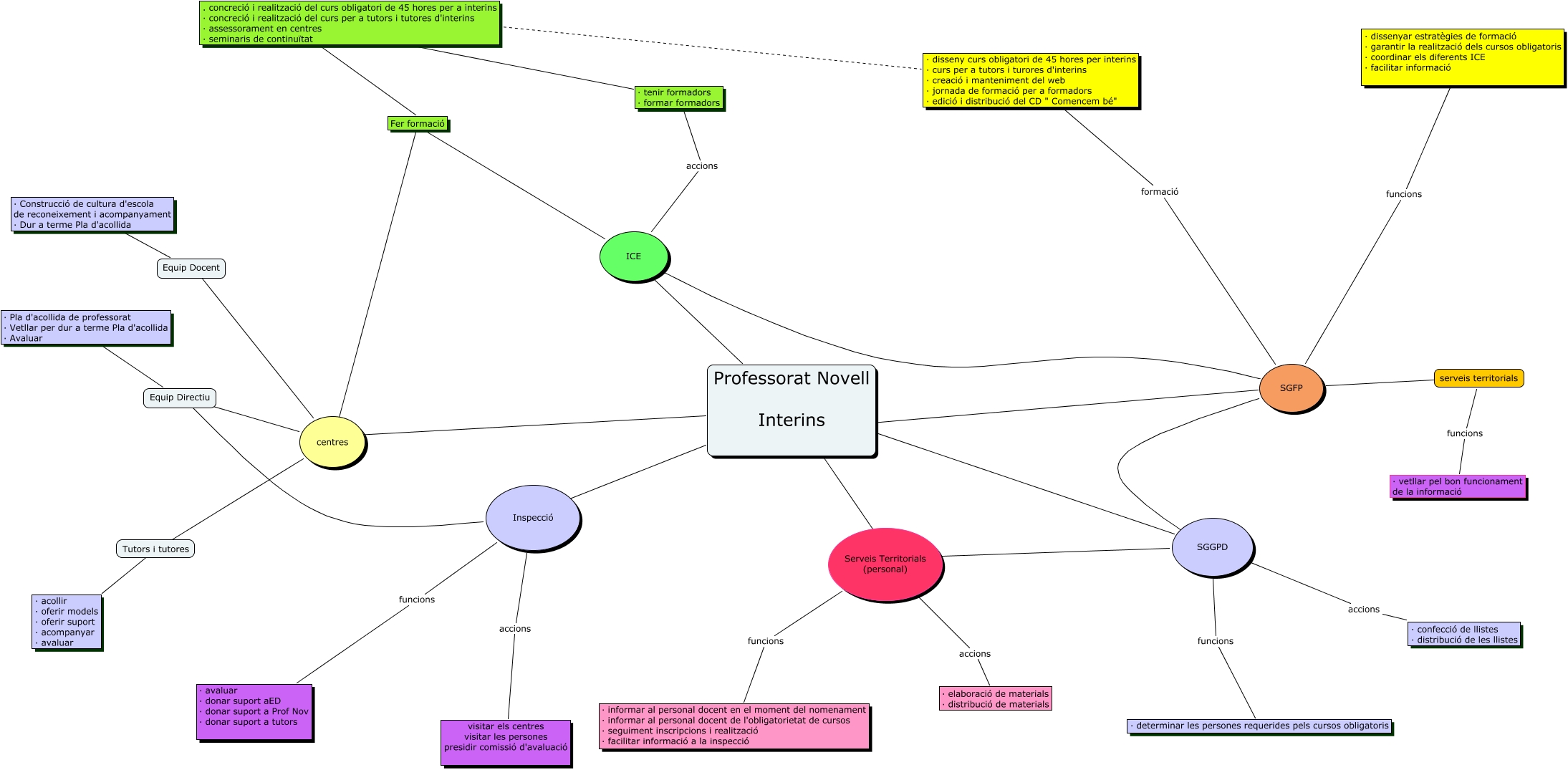 professorat novell, Fer formació ???? centres, centres ???? Tutors i tutores, centres ???? Equip Directiu, SGFP formació · disseny curs obligatori de 45 hores per interins · curs per a tutors i turores d'interins · creació i manteniment del web · jornada de formació per a formadors · edició i distribució del CD " Comencem bé", SGFP funcions · dissenyar estratègies de formació · garantir la realització dels cursos obligatoris · coordinar els diferents ICE · facilitar informació, Serveis Territorials (personal) accions · elaboració de materials · distribució de materials, Professorat Novell Interins ???? SGFP, SGGPD funcions · determinar les persones requerides pels cursos obligatoris, Professorat Novell Interins ???? ICE, ICE accions · tenir formadors · formar formadors
