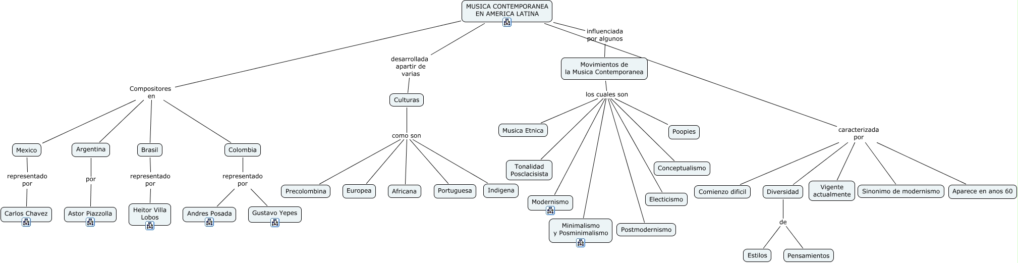 Este mapa conceptual tiene información relacionada a: Musica Contemporanea en AmericaLatina, Movimientos de la Musica Contemporanea los cuales son Conceptualismo, Culturas como son Indigena, MUSICA CONTEMPORANEA EN AMERICA LATINA Compositores en Mexico, MUSICA CONTEMPORANEA EN AMERICA LATINA Compositores en Brasil, MUSICA CONTEMPORANEA EN AMERICA LATINA caracterizada por Sinonimo de modernismo, Movimientos de la Musica Contemporanea los cuales son Postmodernismo, MUSICA CONTEMPORANEA EN AMERICA LATINA caracterizada por Diversidad, MUSICA CONTEMPORANEA EN AMERICA LATINA Compositores en Colombia, Movimientos de la Musica Contemporanea los cuales son Poopies, MUSICA CONTEMPORANEA EN AMERICA LATINA desarrollada apartir de varias Culturas, Brasil representado por Heitor Villa Lobos, MUSICA CONTEMPORANEA EN AMERICA LATINA Compositores en Argentina, Diversidad de Pensamientos, MUSICA CONTEMPORANEA EN AMERICA LATINA caracterizada por Vigente actualmente, Movimientos de la Musica Contemporanea los cuales son Musica Etnica, Colombia representado por Gustavo Yepes, Movimientos de la Musica Contemporanea los cuales son Modernismo, Movimientos de la Musica Contemporanea los cuales son Tonalidad Posclacisista, Mexico representado por Carlos Chavez, Movimientos de la Musica Contemporanea los cuales son Electicismo