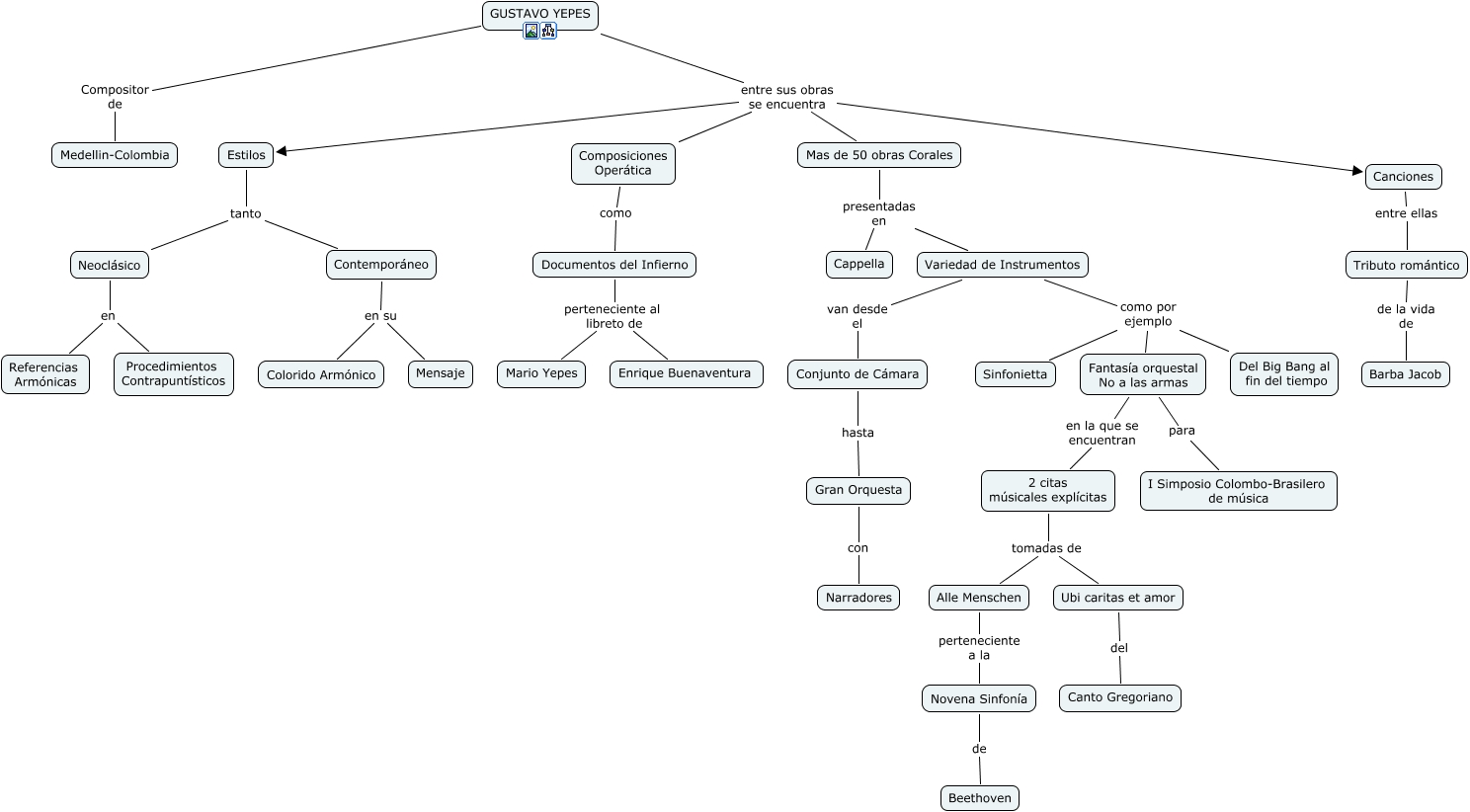 Este mapa conceptual tiene información relacionada a: Gustavo Yepes, Canciones entre ellas Tributo romántico, Tributo romántico de la vida de Barba Jacob, Neoclásico en Procedimientos Contrapuntísticos, Mas de 50 obras Corales presentadas en Variedad de Instrumentos, GUSTAVO YEPES Compositor de Medellin-Colombia, Neoclásico en Referencias Armónicas, Variedad de Instrumentos como por ejemplo Sinfonietta, Documentos del Infierno perteneciente al libreto de Enrique Buenaventura, Fantasía orquestal No a las armas para I Simposio Colombo-Brasilero de música, 2 citas músicales explícitas tomadas de Alle Menschen, Composiciones Operática como Documentos del Infierno, GUSTAVO YEPES entre sus obras se encuentra Canciones, 2 citas músicales explícitas tomadas de Ubi caritas et amor, Ubi caritas et amor del Canto Gregoriano, Variedad de Instrumentos como por ejemplo Fantasía orquestal No a las armas, Fantasía orquestal No a las armas en la que se encuentran 2 citas músicales explícitas, Estilos tanto Neoclásico, Conjunto de Cámara hasta Gran Orquesta, GUSTAVO YEPES entre sus obras se encuentra Mas de 50 obras Corales, Variedad de Instrumentos van desde el Conjunto de Cámara