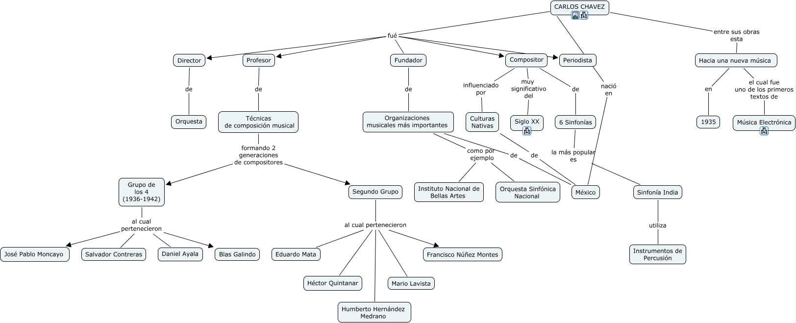 Este mapa conceptual tiene información relacionada a: Carlos Chavez, CARLOS CHAVEZ fué Fundador, CARLOS CHAVEZ fué Profesor, Sinfonía India utiliza Instrumentos de Percusión, Técnicas de composición musical formando 2 generaciones de compositores Segundo Grupo, CARLOS CHAVEZ fué Periodista, Compositor muy significativo del Siglo XX, CARLOS CHAVEZ entre sus obras esta Hacia una nueva música, Grupo de los 4 (1936-1942) al cual pertenecieron Daniel Ayala, Grupo de los 4 (1936-1942) al cual pertenecieron José Pablo Moncayo, Segundo Grupo al cual pertenecieron Eduardo Mata, Hacia una nueva música el cual fue uno de los primeros textos de Música Electrónica, CARLOS CHAVEZ nació en México, Grupo de los 4 (1936-1942) al cual pertenecieron Blas Galindo, 6 Sinfonías la más popular es Sinfonía India, Segundo Grupo al cual pertenecieron Humberto Hernández Medrano, Segundo Grupo al cual pertenecieron Francisco Núñez Montes, Organizaciones musicales más importantes como por ejemplo Orquesta Sinfónica Nacional, Segundo Grupo al cual pertenecieron Mario Lavista, Fundador de Organizaciones musicales más importantes, CARLOS CHAVEZ fué Director