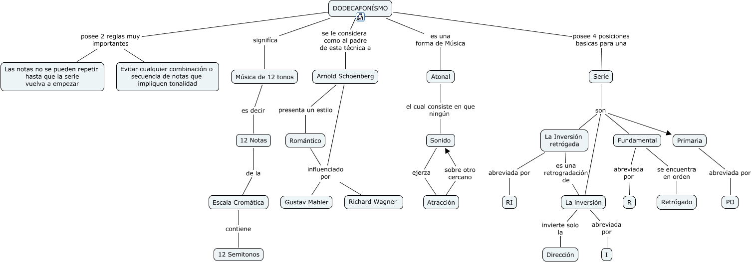 Este mapa conceptual tiene información relacionada a: Dodecafonismo, Arnold Schoenberg influenciado por Richard Wagner, Atracción sobre otro cercano Sonido, DODECAFONÍSMO es una forma de Música Atonal, Arnold Schoenberg influenciado por Gustav Mahler, La inversión abreviada por I, Arnold Schoenberg presenta un estilo Romántico, Fundamental se encuentra en orden Retrógado, Serie son Primaria, 12 Notas de la Escala Cromática, Serie son La inversión, Música de 12 tonos es decir 12 Notas, DODECAFONÍSMO posee 2 reglas muy importantes Las notas no se pueden repetir hasta que la serie vuelva a empezar, DODECAFONÍSMO se le considera como al padre de esta técnica a Arnold Schoenberg, Escala Cromática contiene 12 Semitonos, Serie son La Inversión retrógada, DODECAFONÍSMO posee 2 reglas muy importantes Evitar cualquier combinación o secuencia de notas que impliquen tonalidad, DODECAFONÍSMO posee 4 posiciones basicas para una Serie, Serie son Fundamental, DODECAFONÍSMO signifíca Música de 12 tonos, Sonido ejerza Atracción