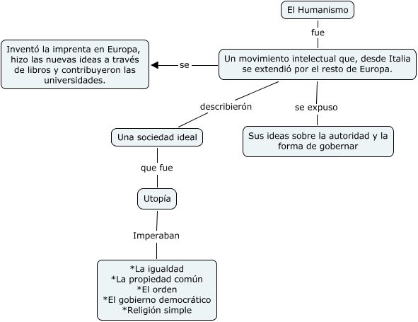 Este mapa conceptual tiene información relacionada a: 11-Ana Estrada Serrano-Humanismo, Utopía Imperaban *La igualdad *La propiedad común *El orden *El gobierno democrático *Religión simple, El Humanismo fue Un movimiento intelectual que, desde Italia se extendió por el resto de Europa., Una sociedad ideal que fue Utopía, Un movimiento intelectual que, desde Italia se extendió por el resto de Europa. se Inventó la imprenta en Europa, hizo las nuevas ideas a través de libros y contribuyeron las universidades., Un movimiento intelectual que, desde Italia se extendió por el resto de Europa. se expuso Sus ideas sobre la autoridad y la forma de gobernar, Un movimiento intelectual que, desde Italia se extendió por el resto de Europa. describierón Una sociedad ideal