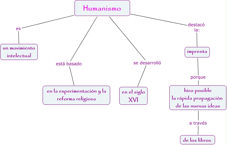 Este mapa conceptual tiene información relacionada a: 22-María Pérez Pedrero-Humanismo, Humanismo es un movimiento intelectual, Humanismo está basado en la experimentación y la reforma religiosa, Humanismo se desarrolló en el siglo XVI, hizo posible la rápida propagación de las nuevas ideas a través de los libros, Humanismo destacó la: imprenta, imprenta porque hizo posible la rápida propagación de las nuevas ideas