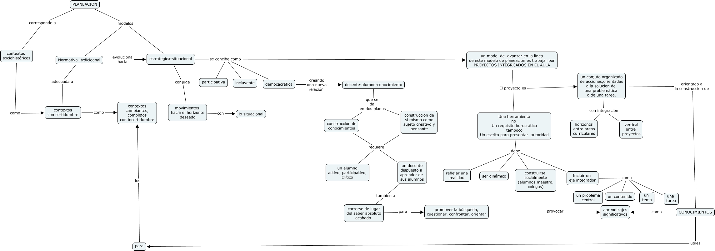 Este Cmap, tiene información relacionada con: planeación estrategicasituacional, construcción de conocimientos requiere un docente dispuesto a aprender de sus alumnos, Una herramienta no Un requisito burocrático tampoco Un escrito para presentar autoridad debe Incluir un eje integrador, PLANEACION modelos estrategica-situacional, un conjuto organizado de acciones,orientadas a la solucion de una problemática o de una tarea. con integración horizontal entre areas curriculares, un modo de avanzar en la linea de este modelo de planeación es trabajar por PROYECTOS INTEGRGADOS EN EL AULA El proyecto es un conjuto organizado de acciones,orientadas a la solucion de una problemática o de una tarea., Normativa -trdicioanal adecuada a contextos con certidumbre, docente-alumno-conocimiento que se da en dos planos construcción de conocimientos, construcción de si mismo como sujeto creativo y pensante requiere un docente dispuesto a aprender de sus alumnos, un conjuto organizado de acciones,orientadas a la solucion de una problemática o de una tarea. con integración vertical entre proyectos, un docente dispuesto a aprender de sus alumnos tambien a correrse de lugar del saber absoluto acabado, construcción de conocimientos requiere un alumno activo, participativo, crítico, para los contextos cambiantes, complejos con incertidumbre, estrategica-situacional conjuga movimientos hacia el horizonte deseado, un conjuto organizado de acciones,orientadas a la solucion de una problemática o de una tarea. orientado a la construccion de CONOCIMIENTOS, PLANEACION corresponde a contextos sociohistóricos, Normativa -trdicioanal evoluciona hacia estrategica-situacional, estrategica-situacional se concibe como incluyente, estrategica-situacional se concibe como un modo de avanzar en la linea de este modelo de planeación es trabajar por PROYECTOS INTEGRGADOS EN EL AULA, un modo de avanzar en la linea de este modelo de planeación es trabajar por PROYECTOS INTEGRGADOS EN EL AULA El proyecto es Una herramienta no Un requisito burocrático tampoco Un escrito para presentar autoridad, Una herramienta no Un requisito burocrático tampoco Un escrito para presentar autoridad debe reflejar una realidad