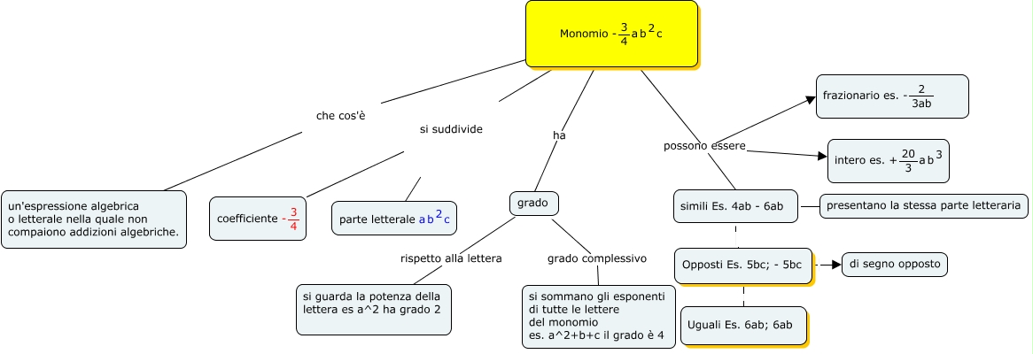 Questa Cmap, creata con IHMC CmapTools, contiene informazioni relative a: Monomi, <math xmlns="http://www.w3.org/1998/Math/MathML"> <mrow> <mtext> Monomio - </mtext> <mfrac> <mtext> 3 </mtext> <mtext> 4 </mtext> </mfrac> <mtext> a </mtext> <mmultiscripts> <mtext> b </mtext> <none/> <mtext> 2 </mtext> </mmultiscripts> <mtext> c </mtext> </mrow> </math> ha grado, <math xmlns="http://www.w3.org/1998/Math/MathML"> <mrow> <mtext> Monomio - </mtext> <mfrac> <mtext> 3 </mtext> <mtext> 4 </mtext> </mfrac> <mtext> a </mtext> <mmultiscripts> <mtext> b </mtext> <none/> <mtext> 2 </mtext> </mmultiscripts> <mtext> c </mtext> </mrow> </math> possono essere <math xmlns="http://www.w3.org/1998/Math/MathML"> <mrow> <mtext> intero es. + </mtext> <mfrac> <mtext> 20 </mtext> <mtext> 3 </mtext> </mfrac> <mtext> a </mtext> <mmultiscripts> <mtext> b </mtext> <none/> <mtext> 3 </mtext> </mmultiscripts> </mrow> </math>, Opposti Es. 5bc; - 5bc Uguali Es. 6ab; 6ab, simili Es. 4ab - 6ab Opposti Es. 5bc; - 5bc, <math xmlns="http://www.w3.org/1998/Math/MathML"> <mrow> <mtext> Monomio - </mtext> <mfrac> <mtext> 3 </mtext> <mtext> 4 </mtext> </mfrac> <mtext> a </mtext> <mmultiscripts> <mtext> b </mtext> <none/> <mtext> 2 </mtext> </mmultiscripts> <mtext> c </mtext> </mrow> </math> si suddivide <math xmlns="http://www.w3.org/1998/Math/MathML"> <mrow> <mtext> coefficiente - </mtext> <mfrac> <mtext> 3 </mtext> <mtext> 4 </mtext> </mfrac> </mrow> </math>, simili Es. 4ab - 6ab presentano la stessa parte letteraria, <math xmlns="http://www.w3.org/1998/Math/MathML"> <mrow> <mtext> Monomio - </mtext> <mfrac> <mtext> 3 </mtext> <mtext> 4 </mtext> </mfrac> <mtext> a </mtext> <mmultiscripts> <mtext> b </mtext> <none/> <mtext> 2 </mtext> </mmultiscripts> <mtext> c </mtext> </mrow> </math> possono essere simili Es. 4ab - 6ab, grado grado complessivo si sommano gli esponenti di tutte le lettere del monomio es. a^2+b+c il grado è 4, <math xmlns="http://www.w3.org/1998/Math/MathML"> <mrow> <mtext> Monomio - </mtext> <mfrac> <mtext> 3 </mtext> <mtext> 4 </mtext> </mfrac> <mtext> a </mtext> <mmultiscripts> <mtext> b </mtext> <none/> <mtext> 2 </mtext> </mmultiscripts> <mtext> c </mtext> </mrow> </math> si suddivide <math xmlns="http://www.w3.org/1998/Math/MathML"> <mrow> <mtext> parte letterale a </mtext> <mmultiscripts> <mtext> b </mtext> <none/> <mtext> 2 </mtext> </mmultiscripts> <mtext> c </mtext> </mrow> </math>, grado rispetto alla lettera si guarda la potenza della lettera es a^2 ha grado 2, <math xmlns="http://www.w3.org/1998/Math/MathML"> <mrow> <mtext> Monomio - </mtext> <mfrac> <mtext> 3 </mtext> <mtext> 4 </mtext> </mfrac> <mtext> a </mtext> <mmultiscripts> <mtext> b </mtext> <none/> <mtext> 2 </mtext> </mmultiscripts> <mtext> c </mtext> </mrow> </math> che cos'è un'espressione algebrica o letterale nella quale non compaiono addizioni algebriche., Opposti Es. 5bc; - 5bc di segno opposto, <math xmlns="http://www.w3.org/1998/Math/MathML"> <mrow> <mtext> Monomio - </mtext> <mfrac> <mtext> 3 </mtext> <mtext> 4 </mtext> </mfrac> <mtext> a </mtext> <mmultiscripts> <mtext> b </mtext> <none/> <mtext> 2 </mtext> </mmultiscripts> <mtext> c </mtext> </mrow> </math> possono essere <math xmlns="http://www.w3.org/1998/Math/MathML"> <mrow> <mtext> frazionario es. - </mtext> <mfrac> <mtext> 2 </mtext> <mtext> 3ab </mtext> </mfrac> </mrow> </math>