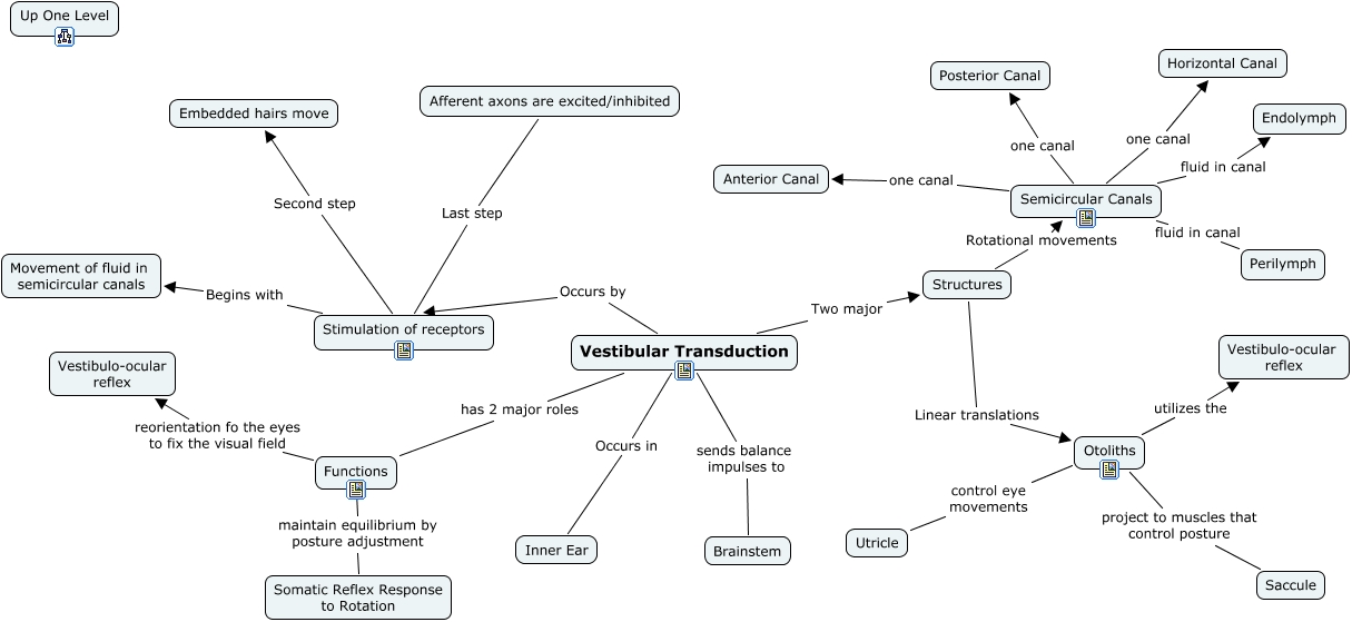 This Concept Map has information related to: vestibular transduction, Stimulation of receptors Begins with Movement of fluid in semicircular canals, Vestibular Transduction Occurs in Inner Ear, Semicircular Canals fluid in canal Perilymph, Otoliths utilizes the Vestibulo-ocular reflex, Functions reorientation fo the eyes to fix the visual field Vestibulo-ocular reflex, Otoliths control eye movements Utricle, Semicircular Canals one canal Horizontal Canal, Vestibular Transduction Two major Structures, Semicircular Canals one canal Anterior Canal, Functions maintain equilibrium by posture adjustment Somatic Reflex Response to Rotation