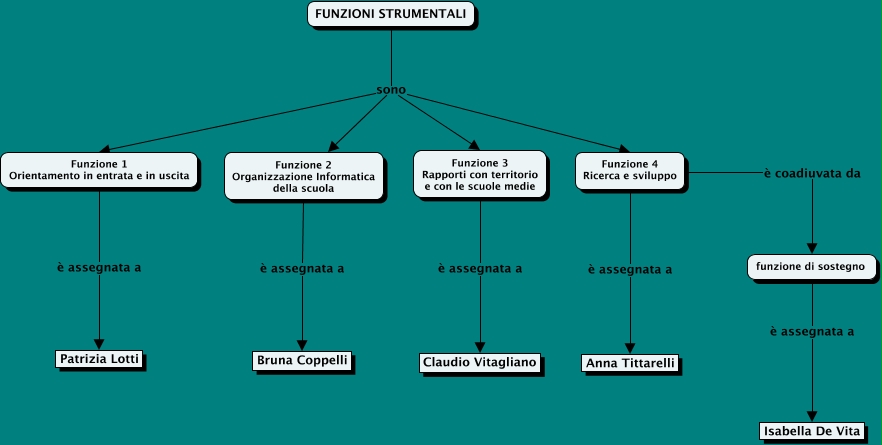 Questa Cmap, creata con IHMC CmapTools, contiene informazioni relative a: Funzioni strumentali, Funzione 4 Ricerca e sviluppo è coadiuvata da funzione di sostegno, Funzione 2 Organizzazione Informatica della scuola è assegnata a Bruna Coppelli, Funzione 3 Rapporti con territorio e con le scuole medie è assegnata a Claudio Vitagliano, Funzione 4 Ricerca e sviluppo è assegnata a Anna Tittarelli, FUNZIONI STRUMENTALI sono Funzione 3 Rapporti con territorio e con le scuole medie, FUNZIONI STRUMENTALI sono Funzione 1 Orientamento in entrata e in uscita, funzione di sostegno è assegnata a Isabella De Vita, FUNZIONI STRUMENTALI sono Funzione 4 Ricerca e sviluppo, FUNZIONI STRUMENTALI sono Funzione 2 Organizzazione Informatica della scuola, Funzione 1 Orientamento in entrata e in uscita è assegnata a Patrizia Lotti
