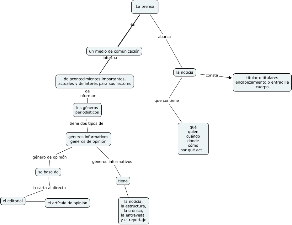 Este mapa conceptual tiene información relacionada a: 11-ana hernández ávila-tema 3, La prensa abarca la noticia, los géneros periodísticos tiene dos tipos de géneros informativos géneros de opinión, la noticia que contiene qué quién cuándo dónde cómo por qué ect..., la noticia consta titular o titulares encabezamiento o entradilla cuerpo, La prensa informa de acontecimientos importantes, actuales y de interés para sus lectores, géneros informativos géneros de opinión géneros informativos tiene, tiene ???? la noticia, la estructura, la crónica, la entrevista y el reportaje, se basa de la carta al directo el editorial, La prensa es un medio de comunicación, el editorial ???? el artículo de opinión