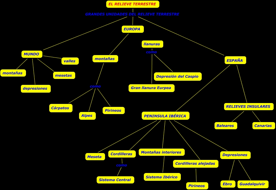Este mapa conceptual tiene información relacionada a: Nicoilas Moreira Piñero 3ºB, PENINSULA IBÉRICA ???? Montañas interiores, ESPAÑA ???? RELIEVES INSULARES, montañas como Cárpatos, MUNDO ???? valles, montañas como Pirineos, RELIEVES INSULARES ???? Canarias, EL RELIEVE TERRESTRE GRANDES UNIDADES DEL RELIEVE TERRESTRE MUNDO, PENINSULA IBÉRICA ???? Cordilleras, MUNDO ???? montañas, EUROPA ???? llanuras