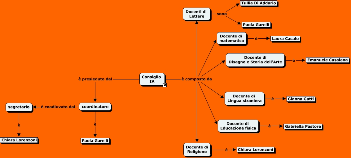 Questa Mappa Concettuale ha informazioni correlate a: Consiglio IA, Consiglio IA è composto da Docente di Educazione fisica, Docente di matematica è Laura Casale, Consiglio IA è presieduto dal coordinatore, Docenti di Lettere sono Paola Garelli, Consiglio IA è composto da Docente di Religione, Docente di Religione è Chiara Lorenzoni, Consiglio IA è composto da Docente di matematica, Consiglio IA è composto da Docente di Disegno e Storia dell'Arte, Consiglio IA è composto da Docenti di Lettere, Docenti di Lettere sono Tullia Di Addario