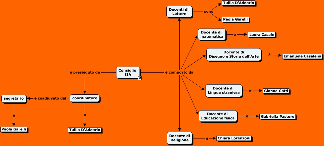 Questa Mappa Concettuale ha informazioni correlate a: Consiglio IIA, Consiglio IIA è composto da Docente di Educazione fisica, Consiglio IIA è presieduto da coordinatore, coordinatore è coadiuvato dal segretario, Docente di matematica è Laura Casale, Consiglio IIA è composto da Docente di Religione, Consiglio IIA è composto da Docente di Disegno e Storia dell'Arte, Consiglio IIA è composto da Docente di matematica, coordinatore è Tullia D'Addario, segretario è Paola Garelli, Consiglio IIA è composto da Docenti di Lettere