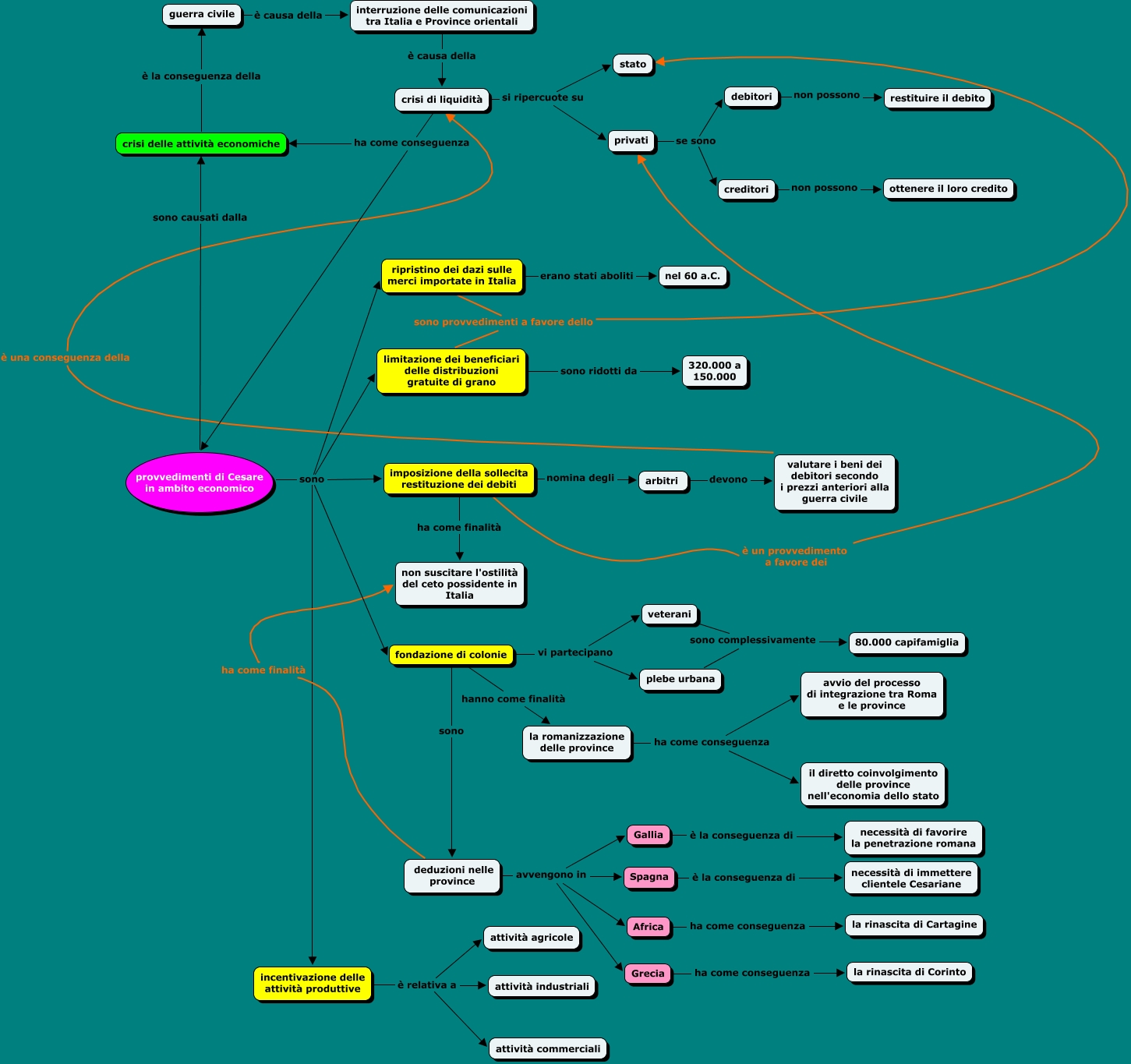 Provvedimenti economici di Cesare, valutare i beni dei debitori secondo i prezzi anteriori alla guerra civile è una conseguenza della crisi di liquidità, provvedimenti di Cesare in ambito economico sono incentivazione delle attività produttive, plebe urbana sono complessivamente 80.000 capifamiglia, provvedimenti di Cesare in ambito economico sono ripristino dei dazi sulle merci importate in Italia, Africa ha come conseguenza la rinascita di Cartagine, crisi di liquidità si ripercuote su privati, fondazione di colonie hanno come finalità la romanizzazione delle province, limitazione dei beneficiari delle distribuzioni gratuite di grano sono ridotti da 320.000 a 150.000, deduzioni nelle province ha come finalità non suscitare l'ostilità del ceto possidente in Italia, imposizione della sollecita restituzione dei debiti è un provvedimento a favore dei privati