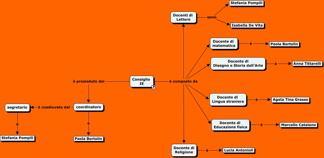 Consiglio IE, Docenti di Lettere sono Isabella De Vita, Docente di matematica è Paola Bortolin, Consiglio IE è composto da Docente di Disegno e Storia dell'Arte, Docente di Lingua straniera è Agata Tina Grasso, Consiglio IE è composto da Docente di Educazione fisica, coordinatore è Paola Bortolin, Docenti di Lettere sono Stefania Pompili, Consiglio IE è presieduto dal coordinatore, Consiglio IE è composto da Docente di Lingua straniera, Docente di Educazione fisica è Marcello Catalano