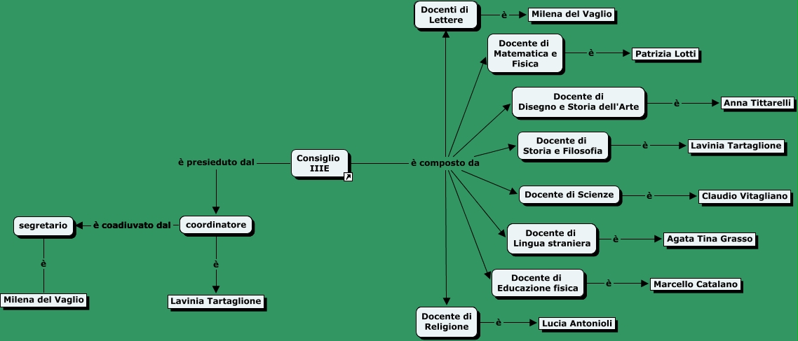 Questa Mappa Concettuale ha informazioni correlate a: Consiglio IIIE, Docente di Religione è Lucia Antonioli, coordinatore è Lavinia Tartaglione, Docente di Disegno e Storia dell'Arte è Anna Tittarelli, Consiglio IIIE è presieduto dal coordinatore, coordinatore è coadiuvato dal segretario, Consiglio IIIE è composto da Docente di Religione, Docente di Storia e Filosofia è Lavinia Tartaglione, Consiglio IIIE è composto da Docente di Storia e Filosofia, Docente di Educazione fisica è Marcello Catalano, Docente di Scienze è Claudio Vitagliano, Docente di Matematica e Fisica è Patrizia Lotti, coordinatore è coadiuvato dal segretario, Consiglio IIIE è composto da Docente di Disegno e Storia dell'Arte, Docente di Lettere è Milena del Vaglio, Consiglio IIIE è composto da Docenti di Lettere, segretario è Milena del Vaglio, Consiglio IIIE è composto da Docente di Educazione fisica, Docente di Lingua straniera è Agata Tina Grasso, Consiglio IIIE è composto da Docente di Lingua straniera, Consiglio IIIE è composto da Docente di Scienze