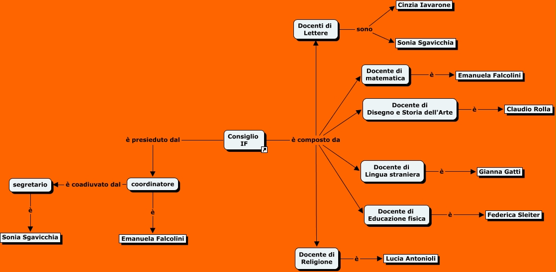 Questa Mappa Concettuale ha informazioni correlate a: Consiglio IF, Docente di Lingua straniera è Gianna Gatti, Consiglio IF è presieduto dal coordinatore, Docenti di Lettere sono Sonia Sgavicchia, Consiglio IF è composto da Docente di Disegno e Storia dell'Arte, coordinatore è coadiuvato dal segretario, Consiglio IF è composto da Docente di Religione, Docenti di Lettere sono Cinzia Iavarone, Consiglio IF è composto da Docenti di Lettere, Docente di Disegno e Storia dell'Arte è Claudio Rolla, Docente di Religione è Lucia Antonioli
