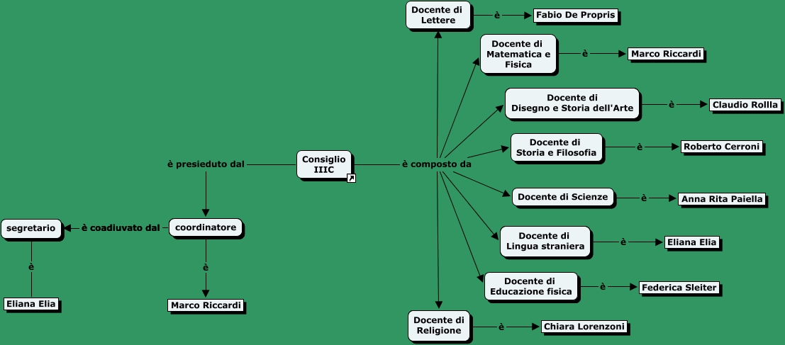 Questa Mappa Concettuale ha informazioni correlate a: Consiglio IIIC, Consiglio IIIC è composto da Docenti di Lettere, Docente di Educazione fisica è Federica Sleiter, Consiglio IIIC è composto da Docente di Lingua straniera, segretario è Eliana Elia, Consiglio IIIC è composto da Docente di Religione, coordinatore è coadiuvato dal segretario, Consiglio IIIC è composto da Docente di Disegno e Storia dell'Arte, coordinatore è coadiuvato dal segretario, Docente di Matematica e Fisica è Marco Riccardi, Docente di Storia e Filosofia è Roberto Cerroni, Consiglio IIIC è composto da Docente di Educazione fisica, Consiglio IIIC è composto da Docente di Scienze, Consiglio IIIC è composto da Docente di Matematica e Fisica, Docente di Disegno e Storia dell'Arte è Claudio Rollla, Docente di Scienze è Anna Rita Paiella, Docente di Religione è Chiara Lorenzoni, coordinatore è Marco Riccardi, Docente di Lettere è Fabio De Propris, Consiglio IIIC è composto da Docente di Storia e Filosofia, Docente di Lingua straniera è Eliana Elia