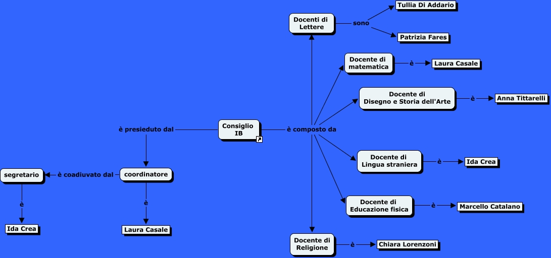 Questa Mappa Concettuale ha informazioni correlate a: Consiglio IIB, coordinatore è coadiuvato dal segretario, segretario è Ida Crea, coordinatore è Laura Casale, Docente di Disegno e Storia dell'Arte è Anna Tittarelli, Docente di Religione è Chiara Lorenzoni, Consiglio IB è composto da Docenti di Lettere, Consiglio IB è composto da Docente di Religione, Docente di Educazione fisica è Marcello Catalano, Consiglio IB è composto da Docente di Disegno e Storia dell'Arte, Consiglio IB è composto da Docente di matematica