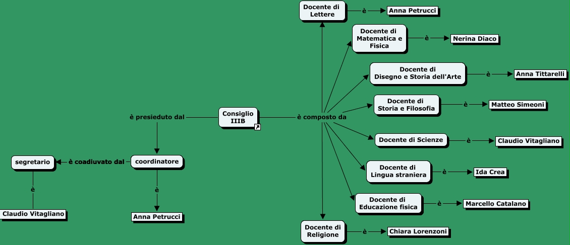 Questa Mappa Concettuale ha informazioni correlate a: Consiglio IIIB, Consiglio IIIB è composto da Docente di Disegno e Storia dell'Arte, Docente di Lettere è Anna Petrucci, Consiglio IIIB è composto da Docente di Matematica e Fisica, coordinatore è coadiuvato dal segretario, Docente di Lingua straniera è Ida Crea, segretario è Claudio Vitagliano, Consiglio IIIB è presieduto dal coordinatore, Docente di Scienze è Claudio Vitagliano, Docente di Disegno e Storia dell'Arte è Anna Tittarelli, coordinatore è coadiuvato dal segretario, Docente di Storia e Filosofia è Matteo Simeoni, Docente di Matematica e Fisica è Nerina Diaco, Docente di Educazione fisica è Marcello Catalano, Consiglio IIIB è composto da Docente di Scienze, Consiglio IIIB è composto da Docente di Storia e Filosofia, Docente di Religione è Chiara Lorenzoni, Consiglio IIIB è composto da Docente di Religione, Consiglio IIIB è composto da Docenti di Lettere, coordinatore è Anna Petrucci, Consiglio IIIB è composto da Docente di Educazione fisica