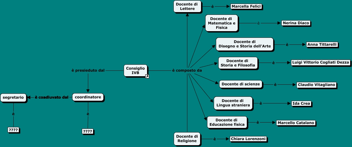 Questa Mappa Concettuale ha informazioni correlate a: Consiglio IVB, Docente di Lingua straniera è Ida Crea, coordinatore è coadiuvato dal segretario, coordinatore è coadiuvato dal segretario, Consiglio IVB è composto da Docente di Storia e Filosofia, Docente di Religione è Chiara Lorenzoni, Consiglio IVB è composto da Docente di matematica e fisica, coordinatore è coadiuvato dal segretario, Consiglio IVB è composto da Docente di Educazione fisica, Docente di Lettere è Marcella Felici, Docente di Storia e Filosofia è Luigi Vittorio Cogliati Dezza, segretario è ????, coordinatore è coadiuvato dal segretario, Consiglio IVB è composto da Docente di Disegno e Storia dell'Arte, coordinatore è ????, Consiglio IVB è presieduto dal coordinatore, Docente di Educazione fisica è Marcello Catalano, Consiglio IVB è composto da Docenti di Lettere, Consiglio IVB è composto da Docente di scienze, Docente di matematica e fisica è Nerina Diaco, Docente di scienze è Claudio Vitagliano