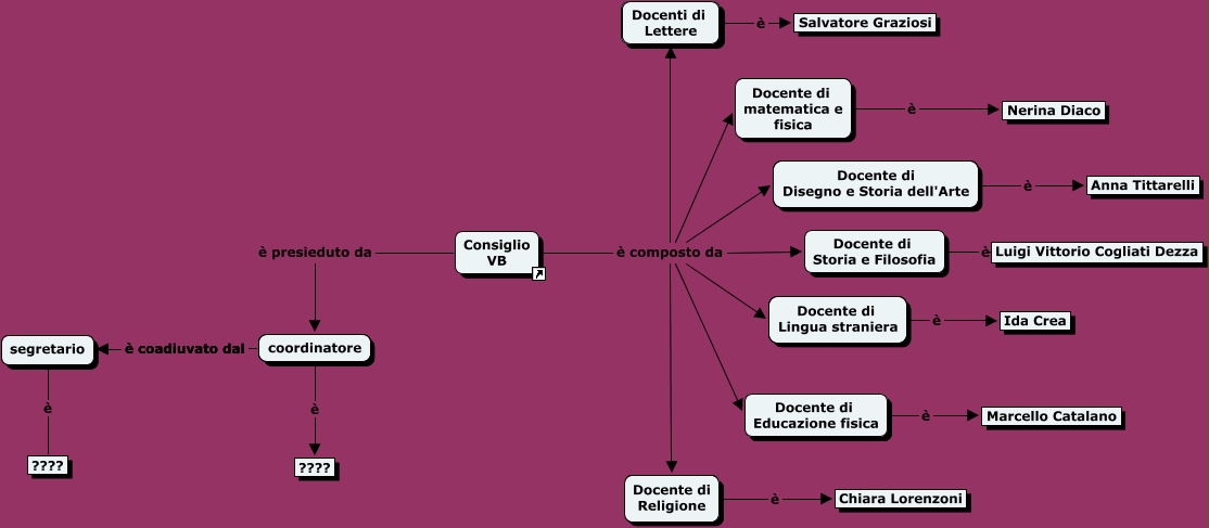 Questa Mappa Concettuale ha informazioni correlate a: Consiglio VB, Consiglio VB è presieduto da coordinatore, Docente di Storia e Filosofia è Luigi Vittorio Cogliati Dezza, Docente di matematica e fisica è Nerina Diaco, segretario è ????, Consiglio VB è composto da Docente di Lingua straniera, Consiglio VB è composto da Docente di Educazione fisica, Docente di Religione è Chiara Lorenzoni, Docente di Lingua straniera è Ida Crea, Docente di Educazione fisica è Marcello Catalano, Consiglio VB è composto da Docente di Storia e Filosofia, Consiglio VB è composto da Docente di Religione, Consiglio VB è composto da Docente di matematica e fisica, coordinatore è ????, Docente di Lettere è Salvatore Graziosi, Consiglio VB è composto da Docente di Disegno e Storia dell'Arte, coordinatore è coadiuvato dal segretario, Docente di Disegno e Storia dell'Arte è Anna Tittarelli, Consiglio VB è composto da Docenti di Lettere, coordinatore è coadiuvato dal segretario
