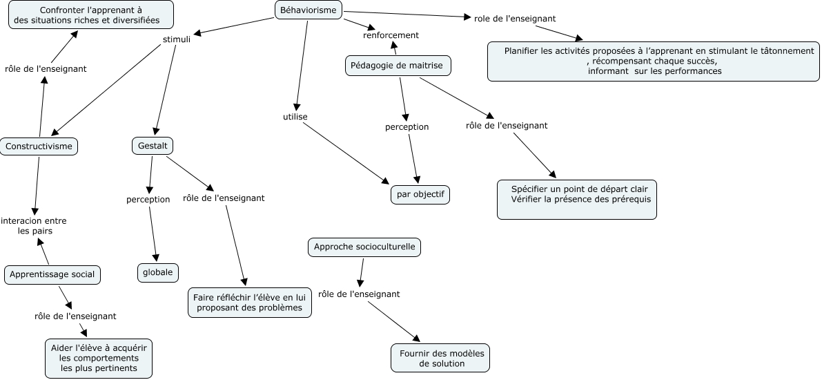 This Concept Map, created with IHMC CmapTools, has information related to: 1ére carte des 6 familles à compléter (max), Béhaviorisme role de l'enseignant Planifier les activités proposées à l’apprenant en stimulant le tâtonnement , récompensant chaque succès, informant sur les performances, Pédagogie de maitrise perception par objectif, Béhaviorisme stimuli Gestalt, Gestalt perception globale, Béhaviorisme stimuli Constructivisme, Apprentissage social rôle de l'enseignant Aider l'élève à acquérir les comportements les plus pertinents, Approche socioculturelle rôle de l'enseignant Fournir des modèles de solution, Gestalt rôle de l'enseignant Faire réfléchir l’élève en lui proposant des problèmes, Béhaviorisme utilise par objectif, Pédagogie de maitrise rôle de l'enseignant Spécifier un point de départ clair Vérifier la présence des prérequis, Constructivisme rôle de l'enseignant Confronter l'apprenant à des situations riches et diversifiées