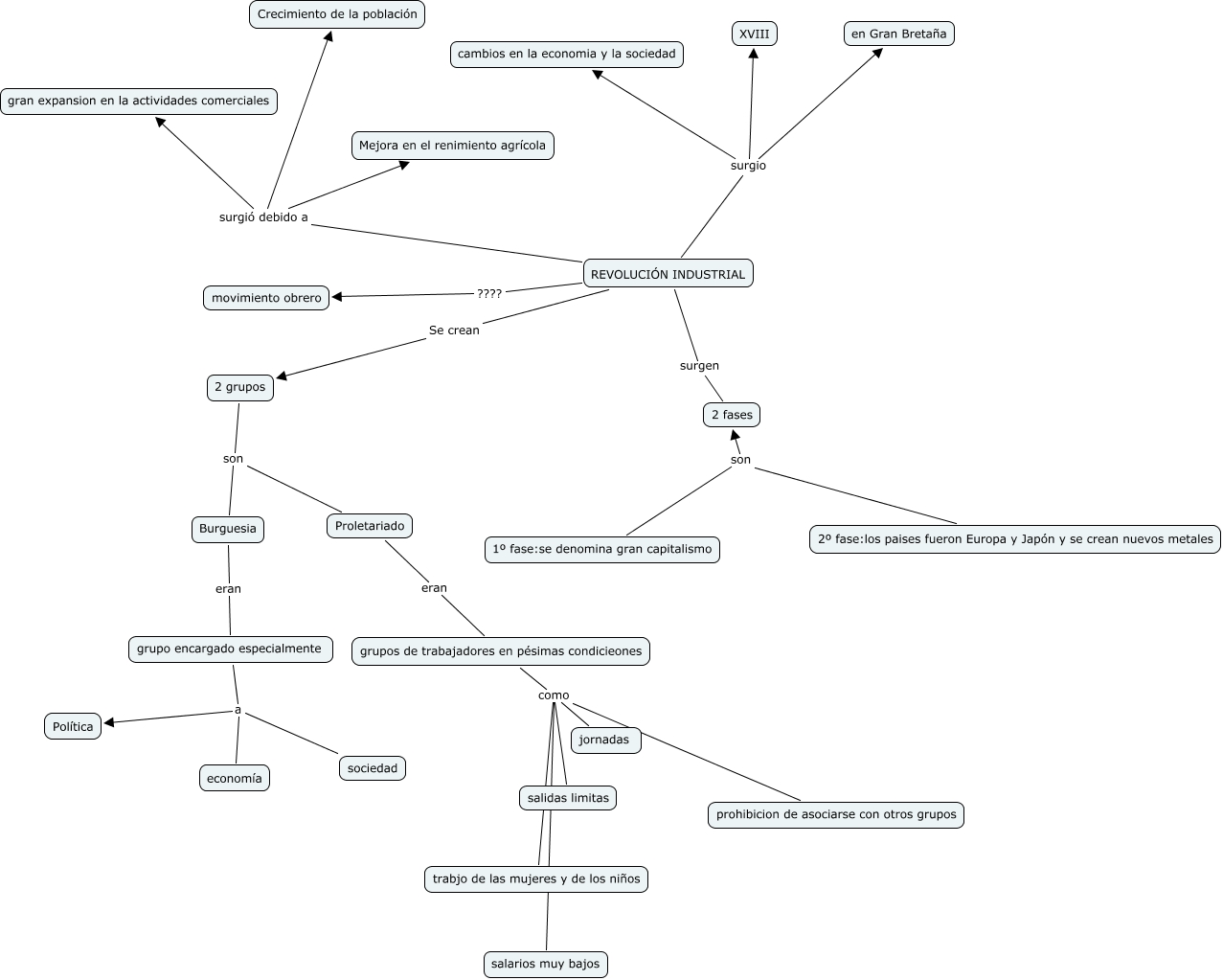 Este mapa conceptual tiene información relacionada a: 15. Ana Muñoz Rivera LA REVOLUCIÓN INDUSTRIAL, grupos de trabajadores en pésimas condicieones como trabjo de las mujeres y de los niños, REVOLUCIÓN INDUSTRIAL surgio XVIII, REVOLUCIÓN INDUSTRIAL ???? movimiento obrero, REVOLUCIÓN INDUSTRIAL surgió debido a Mejora en el renimiento agrícola, REVOLUCIÓN INDUSTRIAL surgio cambios en la economia y la sociedad, REVOLUCIÓN INDUSTRIAL surgio en Gran Bretaña, Proletariado eran grupos de trabajadores en pésimas condicieones, 1º fase:se denomina gran capitalismo son 2 fases, 2 grupos son Proletariado, 2 grupos son Burguesia