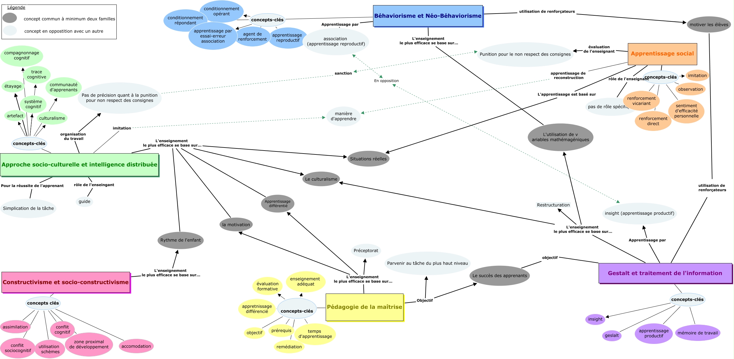 This Concept Map, created with IHMC CmapTools, has information related to: carte conceptuelle des 6 familles- ESSAIE 4, Gestalt et traitement de l'information L'enseignement le plus efficace se base sur... L'utilisation de v ariables mathémagéniques, Gestalt et traitement de l'information concepts-clés apprentissage productif, Approche socio-culturelle et intelligence distribuée L'enseignement le plus efficace se base sur... Le culturalisme, Gestalt et traitement de l'information concepts-clés mémoire de travail, Pédagogie de la maîtrise concepts-clés temps d'apprentissage, Apprentissage social apprentissage de reconstruction manière d'apprendre, Pédagogie de la maîtrise L'enseignement le plus efficace se base sur... Préceptorat, Approche socio-culturelle et intelligence distribuée concepts-clés système cognitif, Approche socio-culturelle et intelligence distribuée Pour la réussite de l'apprenant Simplication de la tâche, Pas de précision quant à la punition pour non respect des consignes sanction Punition pour le non respect des consignes, Pédagogie de la maîtrise concepts-clés enseignement adéquat, Apprentissage social évaluation de l'enseignant Punition pour le non respect des consignes, Approche socio-culturelle et intelligence distribuée concepts-clés compagnonnage cognitif, Approche socio-culturelle et intelligence distribuée concepts-clés communauté d'apprenants, Pédagogie de la maîtrise concepts-clés évaluation formative, Approche socio-culturelle et intelligence distribuée concepts-clés culturalisme, Gestalt et traitement de l'information concepts-clés geslalt, Pédagogie de la maîtrise concepts-clés objectif, Béhaviorisme et Néo-Béhaviorisme concepts-clés apprentissage reproductif, Apprentissage social concepts-clés renforcement vicariant