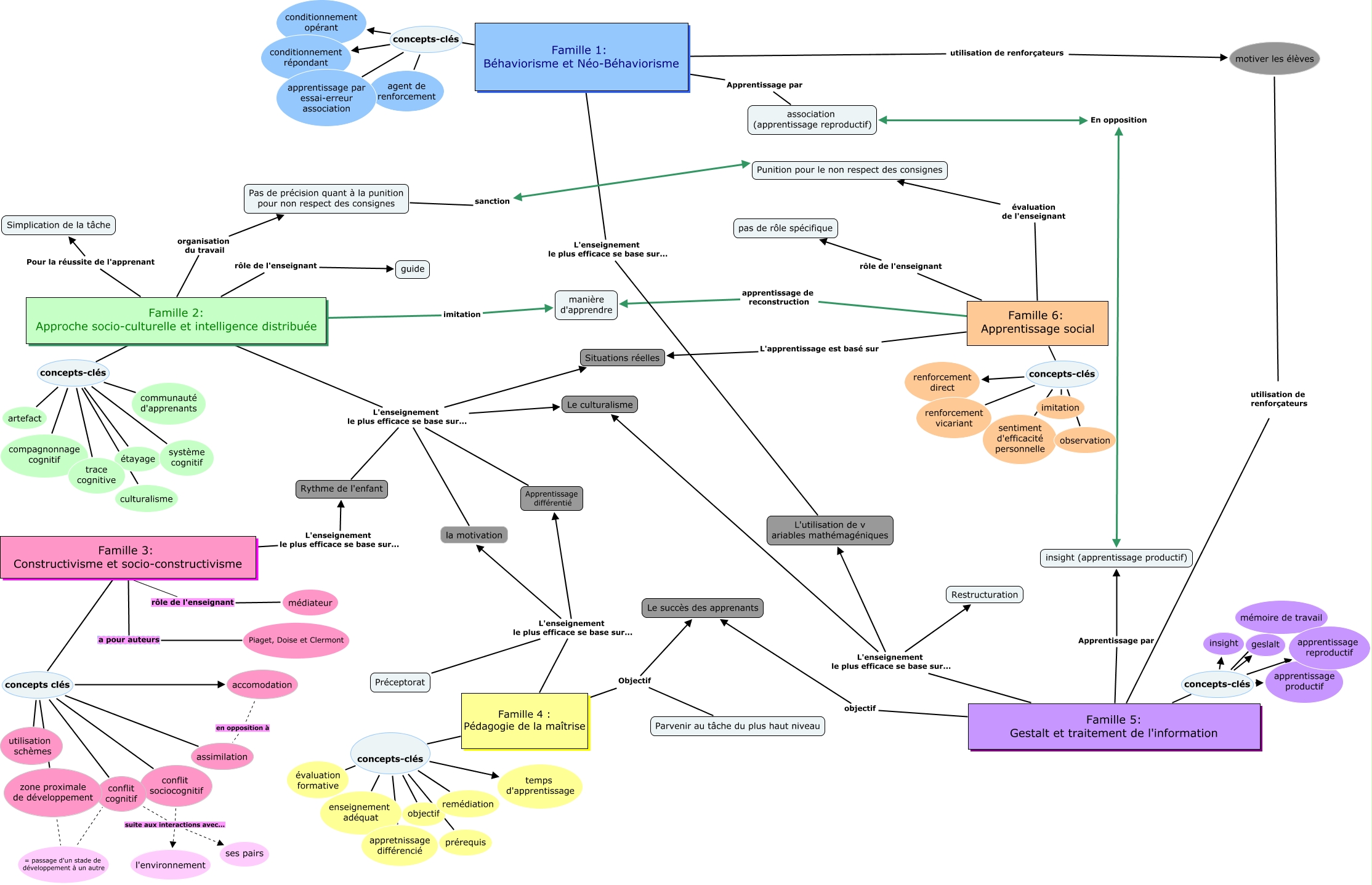 This Concept Map, created with IHMC CmapTools, has information related to: Carte conceptuelle des 6 familles- ESSAI 4 modifiée, Famille 4 : Pédagogie de la maîtrise Objectif Parvenir au tâche du plus haut niveau, Famille 6: Apprentissage social rôle de l'enseignant pas de rôle spécifique, Famille 4 : Pédagogie de la maîtrise concepts-clés objectif, Famille 6: Apprentissage social concepts-clés renforcement direct, conflit cognitif suite aux interactions avec... conflit sociocognitif, conflit cognitif suite aux interactions avec... l'environnement, Famille 3: Constructivisme et socio-constructivisme concepts clés conflit sociocognitif, Famille 2: Approche socio-culturelle et intelligence distribuée concepts-clés système cognitif, Famille 4 : Pédagogie de la maîtrise concepts-clés enseignement adéquat, Famille 2: Approche socio-culturelle et intelligence distribuée imitation manière d'apprendre, Famille 6: Apprentissage social concepts-clés renforcement vicariant, Famille 5: Gestalt et traitement de l'information L'enseignement le plus efficace se base sur... Restructuration, Famille 3: Constructivisme et socio-constructivisme a pour auteurs Piaget, Doise et Clermont, zone proximale de développement = passage d'un stade de développement à un autre conflit cognitif, Famille 4 : Pédagogie de la maîtrise concepts-clés prérequis, Famille 4 : Pédagogie de la maîtrise L'enseignement le plus efficace se base sur... Apprentissage différentié, Famille 1: Béhaviorisme et Néo-Béhaviorisme concepts-clés agent de renforcement, conflit cognitif suite aux interactions avec... ses pairs, Famille 3: Constructivisme et socio-constructivisme concepts clés conflit cognitif, Famille 4 : Pédagogie de la maîtrise concepts-clés remédiation