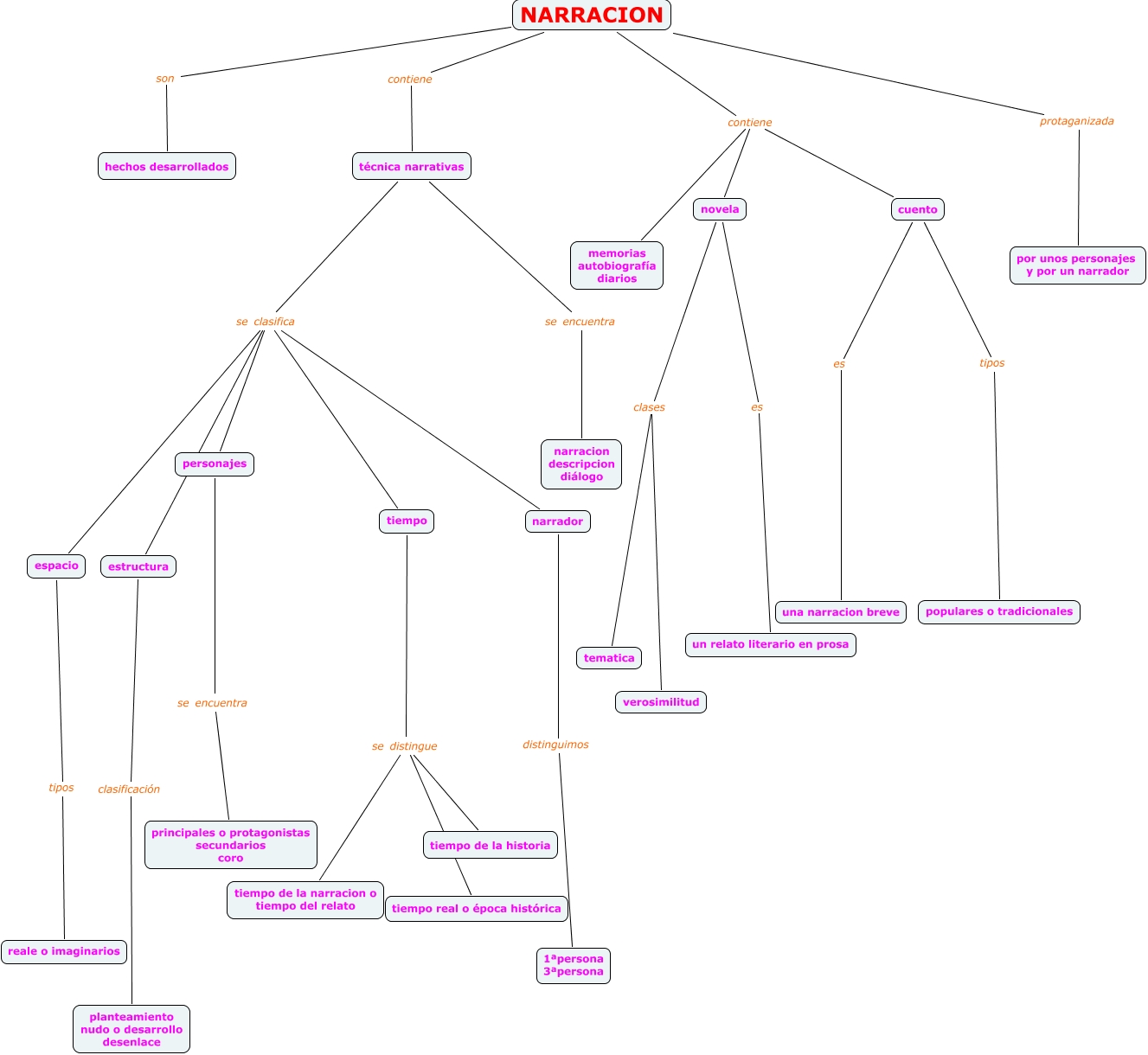 Este mapa conceptual tiene información relacionada a: marta marin y maria castillo, narrador distinguimos 1ªpersona 3ªpersona, NARRACION contiene novela, personajes se encuentra principales o protagonistas secundarios coro, novela clases verosimilitud, tiempo se distingue tiempo real o época histórica, tiempo se distingue tiempo de la narracion o tiempo del relato, espacio tipos reale o imaginarios, NARRACION contiene memorias autobiografía diarios, técnica narrativas se clasifica personajes, NARRACION protaganizada por unos personajes y por un narrador