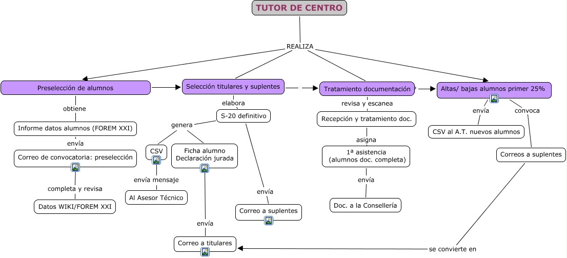 Este mapa conceptual tiene información relacionada a: Tutor de centro, Tratamiento documentación revisa y escanea Recepción y tratamiento doc., TUTOR DE CENTRO REALIZA Selección titulares y suplentes, TUTOR DE CENTRO REALIZA Altas/ bajas alumnos primer 25%, Altas/ bajas alumnos primer 25% convoca Correos a suplentes, Tratamiento documentación ???? Altas/ bajas alumnos primer 25%, Ficha alumno Declaración jurada envía Correo a titulares, Preselección de alumnos obtiene Informe datos alumnos (FOREM XXI), CSV envía mensaje Al Asesor Técnico, TUTOR DE CENTRO REALIZA Preselección de alumnos, Correos a suplentes se convierte en Correo a titulares, Correo de convocatoria: preselección completa y revisa Datos WIKI/FOREM XXI, Informe datos alumnos (FOREM XXI) envía Correo de convocatoria: preselección, TUTOR DE CENTRO REALIZA Tratamiento documentación, 1ª asistencia (alumnos doc. completa) envía Doc. a la Consellería, Altas/ bajas alumnos primer 25% envía CSV al A.T. nuevos alumnos, Preselección de alumnos ???? Selección titulares y suplentes, Selección titulares y suplentes Tratamiento documentación, Recepción y tratamiento doc. asigna 1ª asistencia (alumnos doc. completa), S-20 definitivo genera CSV, S-20 definitivo genera Ficha alumno Declaración jurada
