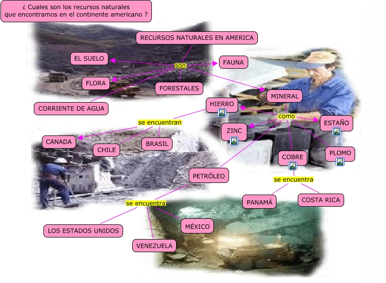 MINERALES, RECURSOS NATURALES EN AMERICA son FLORA, COBRE se encuentra COSTA RICA, HIERRO se encuentran BRASIL, PETRÓLEO se encuentra LOS ESTADOS UNIDOS, RECURSOS NATURALES EN AMERICA son FAUNA, COBRE se encuentra PANAMÁ, PETRÓLEO se encuentra MÉXICO, RECURSOS NATURALES EN AMERICA son EL SUELO, MINERAL como HIERRO, RECURSOS NATURALES EN AMERICA son CORRIENTE DE AGUA