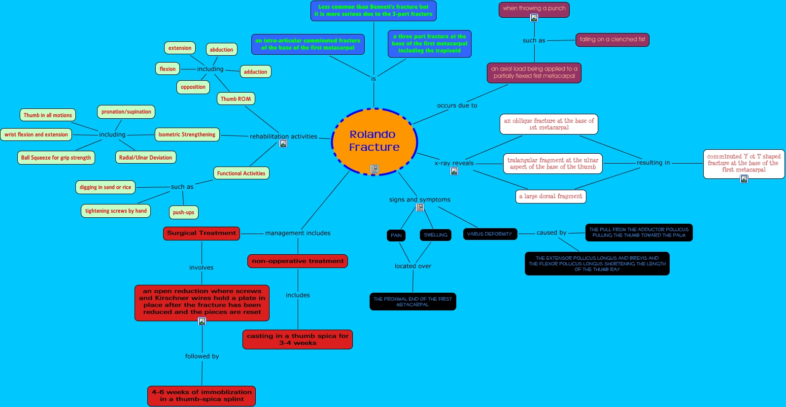 This Concept Map has information related to: Rolando Fracture, Isometric Strengthening including Ball Squeeze for grip strength, Rolando Fracture rehabilitation activities Isometric Strengthening, an axial load being applied to a partially flexed first metacarpal such as when throwing a punch, Varus deformity caused by the extensor pollicus longus and brevis and the flexor pollicus longus shortening the length of the thumb ray, Swelling located over the proximal end of the first metacarpal, Rolando Fracture is a three part fracture at the base of the first metacarpal including the trapizoid, an axial load being applied to a partially flexed first metacarpal such as falling on a clenched fist, a large dorsal fragment resulting in comminuted Y ot T shaped fracture at the base of the first metacarpal, Functional Activities such as push-ups, Surgical Treatment involves an open reduction where screws and Kirschner wires hold a plate in place after the fracture has been reduced and the pieces are reset