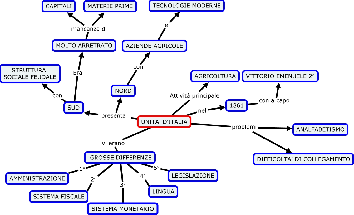 sto, GROSSE DIFFERENZE 3° SISTEMA MONETARIO, GROSSE DIFFERENZE 5° LEGISLAZIONE, GROSSE DIFFERENZE 1° AMMINISTRAZIONE, UNITA' D'ITALIA Attività principale AGRICOLTURA, SUD con STRUTTURA SOCIALE FEUDALE, NORD con AZIENDE AGRICOLE, GROSSE DIFFERENZE 4° LINGUA, AZIENDE AGRICOLE e TECNOLOGIE MODERNE, SUD Era MOLTO ARRETRATO, 1861 con a capo VITTORIO EMENUELE 2°