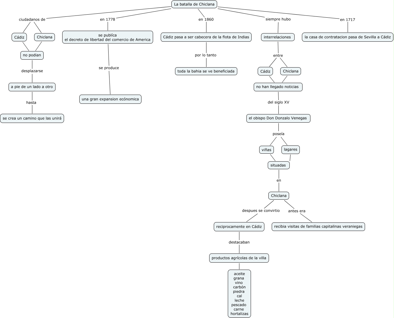 Este mapa conceptual tiene información relacionada a: Ana Muñoz Rivera, La batalla de Chiclana ciudadanos de Chiclana, situadas en Chiclana, Cádiz pasa a ser cabecera de la flota de Indias por lo tanto toda la bahia se ve beneficiada, no han llegado noticias del siglo XV el obispo Don Donzalo Venegas, interrelaciones entre Chiclana, a pie de un lado a otro hasta se crea un camino que las unirá, La batalla de Chiclana siempre hubo interrelaciones, Cádiz no podian, La batalla de Chiclana en 1717 la casa de contratacion pasa de Sevilla a Cádiz, el obispo Don Donzalo Venegas poseía viñas