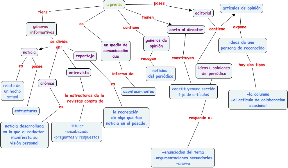 Este mapa conceptual tiene información relacionada a: La prensa -.Monica Bolaños Rivera-nº3 TEMA3, articulos de opinión expone ideas de una persona de reconocido, géneros informativos se divide en: reportaje, crónica es noticia desarrollada en la que el redactor manifiesta su visión personal, carta al director constituyen constituyenuna sección fija de artículos, editorial contiene articulos de opinión, editorial contiene ideas u opiniones del periódico, un medio de comunicación que informa de acontecimientos, la prensa tienen carta al director, noticia posee estructuras, géneros informativos se divide en: entrevista