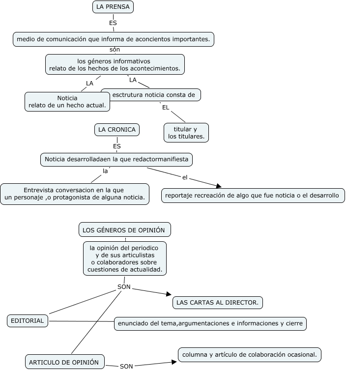 Este mapa conceptual tiene información relacionada a: 16-jorge morales martín TEMA 3, Noticia desarrolladaen la que redactormanifiesta la Entrevista conversacion en la que un personaje ,o protagonista de alguna noticia., la opinión del periodico y de sus articulistas o colaboradores sobre cuestiones de actualidad. SON LAS CARTAS AL DIRECTOR., LOS GÉNEROS DE OPINIÓN son la opinión del periodico y de sus articulistas o colaboradores sobre cuestiones de actualidad., los géneros informativos relato de los hechos de los acontecimientos. LA Noticia relato de un hecho actual., la opinión del periodico y de sus articulistas o colaboradores sobre cuestiones de actualidad. SON ARTICULO DE OPINIÓN, la esctrutura noticia consta de EL titular y los titulares., LA PRENSA ES medio de comunicación que informa de aconcientos importantes., la opinión del periodico y de sus articulistas o colaboradores sobre cuestiones de actualidad. SON EDITORIAL, ARTICULO DE OPINIÓN SON columna y artículo de colaboración ocasional., LA CRONICA ES Noticia desarrolladaen la que redactormanifiesta