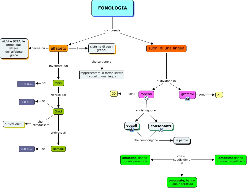 Questa Cmap, creata con IHMC CmapTools, contiene informazioni relative a: fonologia, fonemi si distinguono consonanti, fenici ripreso dai Greci, grafemi sono 21, Greci nel 800 a.C., alfabeto deriva da ALFA e BETA, le prime due lettere dell'alfabeto greco, Greci che introdussero 4 novi segni, FONOLOGIA comprende alfabeto, FONOLOGIA comprende suoni di una lingua, le parole che si suddividono in omonime,hanno lo stesso significato, fonemi sono 30, alfabeto inventato dai fenici, suoni di una lingua si dividono in fonemi, fonemi si distinguono vocali, le parole che si suddividono in omografe, hanno uguale scrittura, suoni di una lingua si dividono in grafemi, fenici nel 1000 a.C., Greci arrivato ai Romani, Romani nel 700 a.C., alfabeto è sistema di segni grafici, vocali che compongono le parole