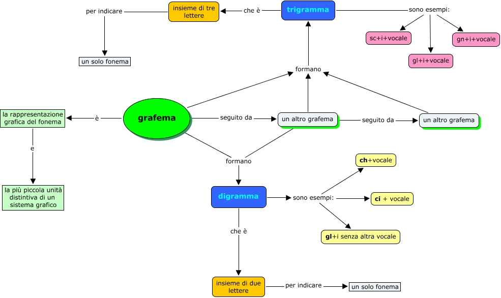 Questa Mappa Concettuale ha informazioni correlate a: grafema, insieme di due lettere per indicare un solo fonema, grafema è la rappresentazione grafica del fonema, un altro grafema seguito da un altro grafema, digramma sono esempi: ch+vocale, grafema formano digramma, digramma sono esempi: gl+i senza altra vocale, trigramma sono esempi: sc+i+vocale, la rappresentazione grafica del fonema e la più piccola unità distintiva di un sistema grafico, un altro grafema formano trigramma, trigramma sono esempi: gn+i+vocale, insieme di tre lettere per indicare un solo fonema, un altro grafema formano digramma, digramma che è insieme di due lettere, grafema formano trigramma, grafema seguito da un altro grafema, trigramma sono esempi: gl+i+vocale, trigramma che è insieme di tre lettere, un altro grafema formano trigramma, digramma sono esempi: ci + vocale